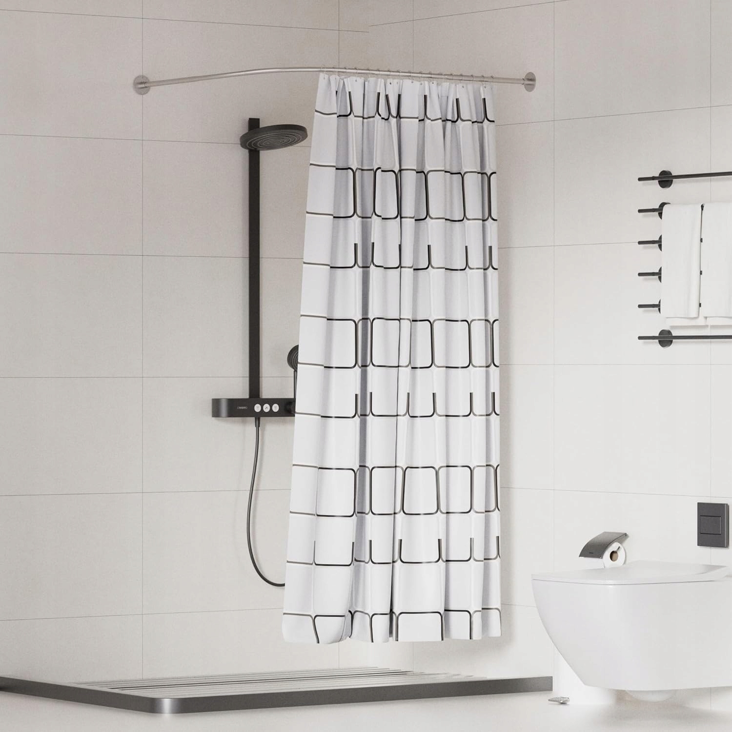 🛁🛁【Розміри】 Діапазон регулювання з обох сторін становить 80-100 см, у цьому діапазоні ви можете вибрати будь-який простір, який підходить для ванної кімнати/гардеробної/ванни. Порада. Завіси для душу зі штангою для душу немає.