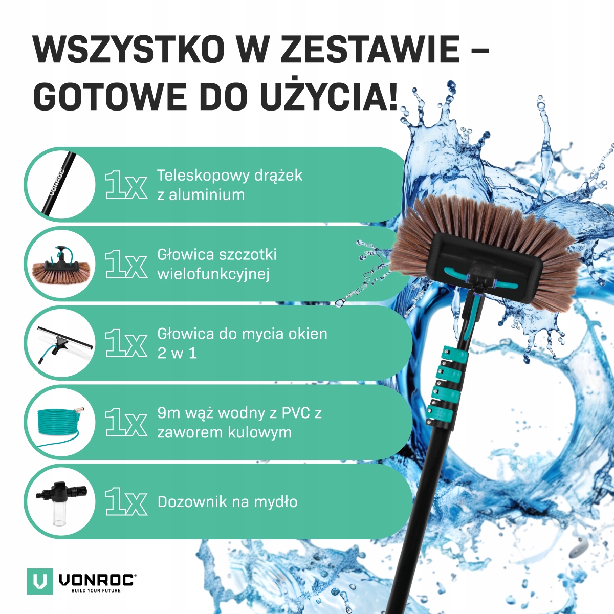 vonroc телескопічна щітка промивання - діапазон 6,5 м | Повний набір шлангом та дозатором мила