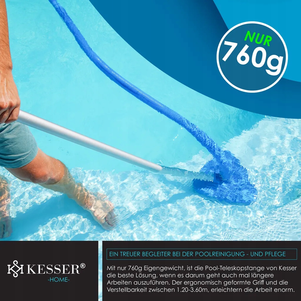 Кессер - чистий вибір! Це означає, що навіть важкі -дорічні місця можна легко очистити. Варто придбати нашу телескопічну ручку підтримки, навіть якщо у вас немає басейну в землі, а точніше невеликий наземний басейн. Телескопічний басейн Кессера, вагою всього 760 г, є найкращим рішенням для більш тривалої роботи. Ергономічна ручка високої якості може бути скоригована з точки зору від 1,20 м до 3,60 м. - Просто полегшення!