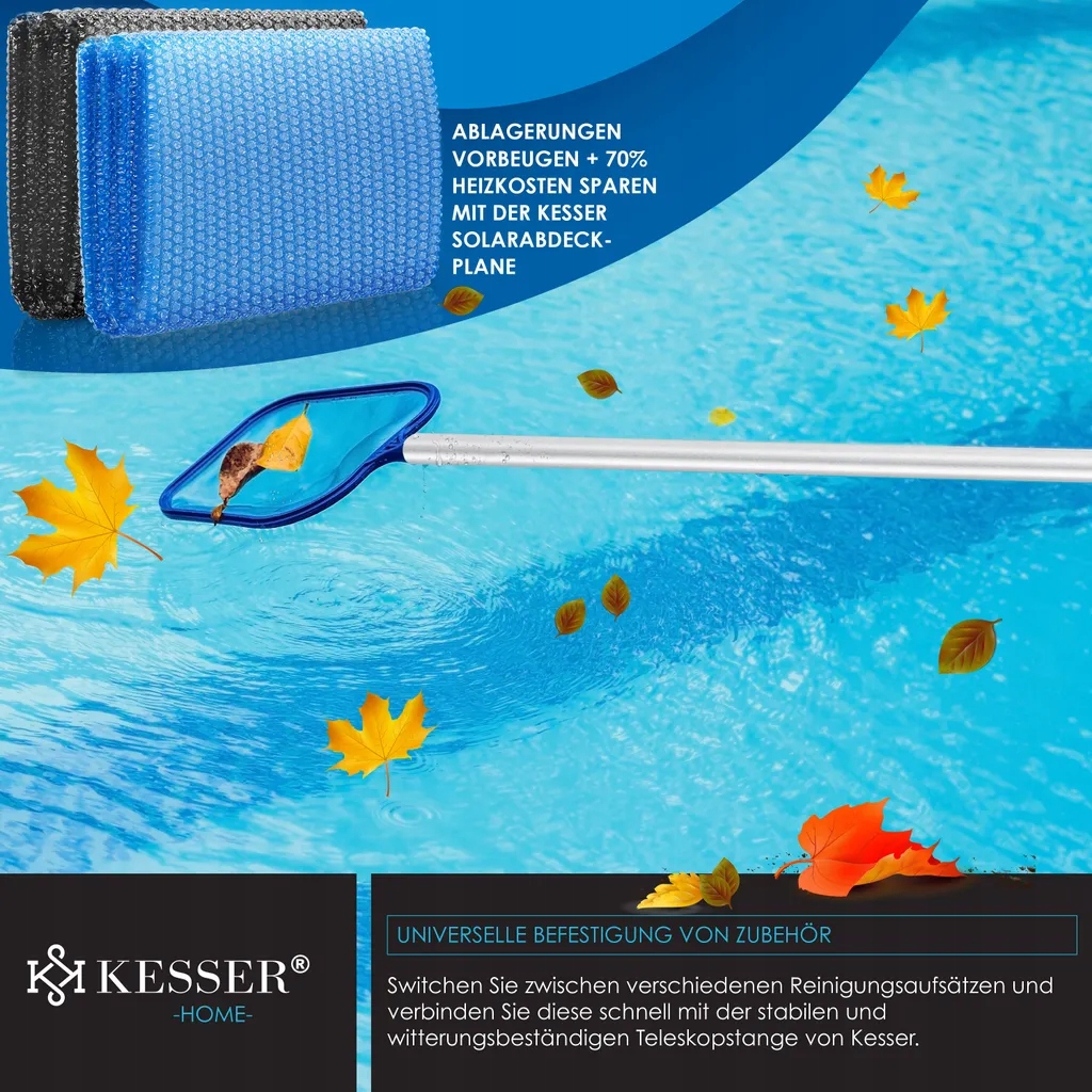 Завдяки універсальному кріпленню, ви можете перемикатися між різними кріпленнями для чищення та швидко підключити їх до стабільної та стійкої телескопічної палички Кессера. Завдяки діаметру трубки 30,4 мм, наша посадкова сітка сумісна з кожним аксесуаром з діаметром 30 мм. Як додатковий захист від бруду, ми рекомендуємо сонячний брезент Kesser, що ще більше запобігає депозитам та економить додаткові 70% на витрати на опалення.