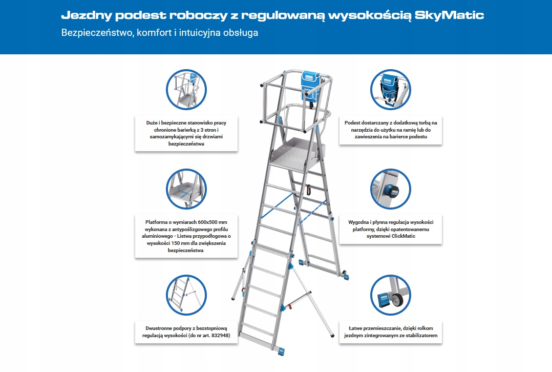 Алюмінієва мобільна платформа з одностороннім входом, оснащена великою робочою платформою з регульованою висотою, захищеною з усіх боків поручнями та бортиком висотою 150 мм. SkyMatic означає безпечну та комфортну роботу в поєднанні зі швидким та легким керуванням. Опис: