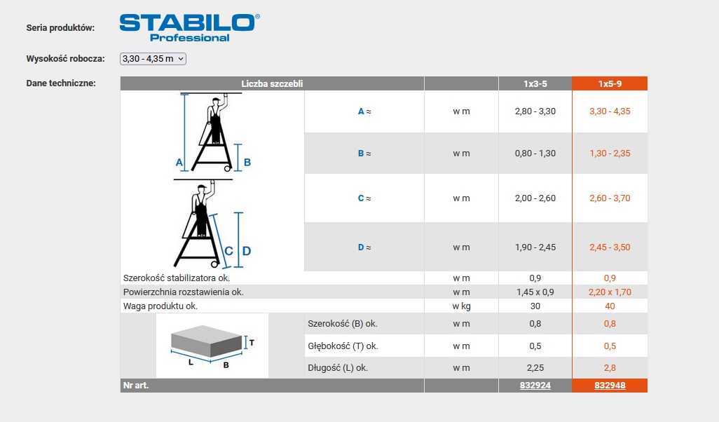 - У версії платформи від 1x3 до 1x5 щаблів запропонована робоча висота: від 2,80 м до 3,30 м; у версії платформи від 1x5 до 1x9 ступенів, робоча висота: від 3,30 м до 4,35 м