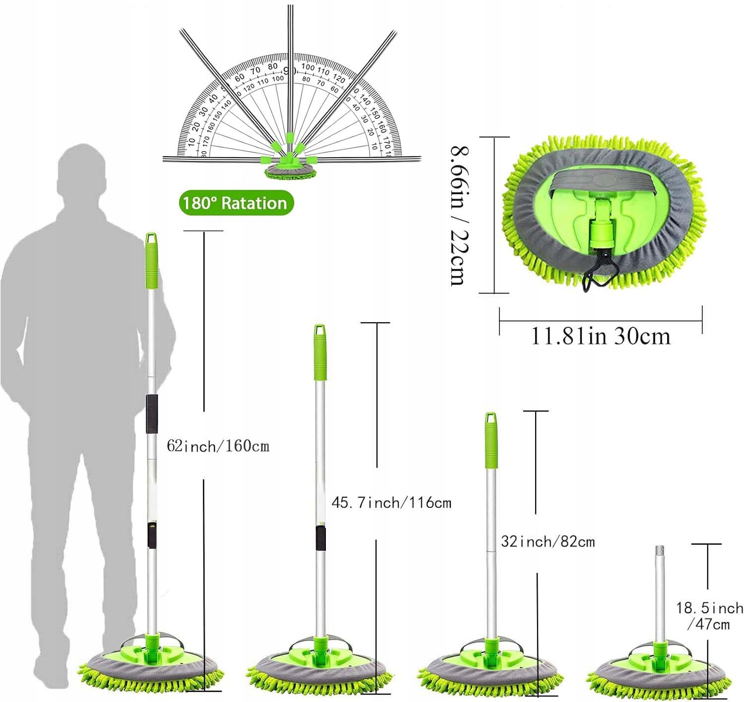 Довга щітка для миття автомобіля 160 см легко дістанеться до даху вашого автомобіля та інших високих місць, тому ви не не треба так багато рухатися. Телескопічна конструкція та регульована на 180 градусів голівка швабри дають вам більше гнучкості під час миття автомобіля та гарантують, що ви можете легко виконати повне прибирання. Ця ідеальна швабра для миття автомобіля може ефективно заощадити ваш час!