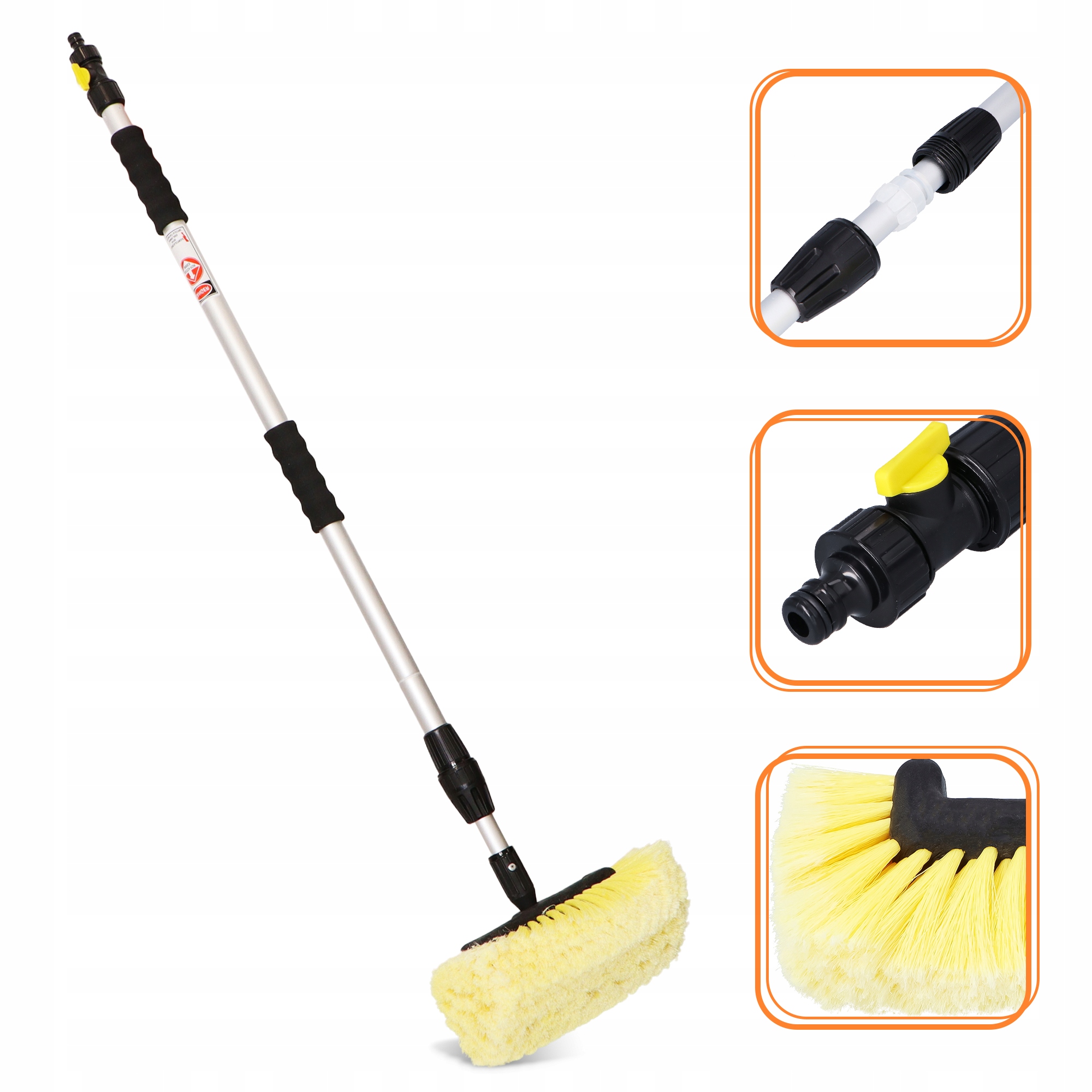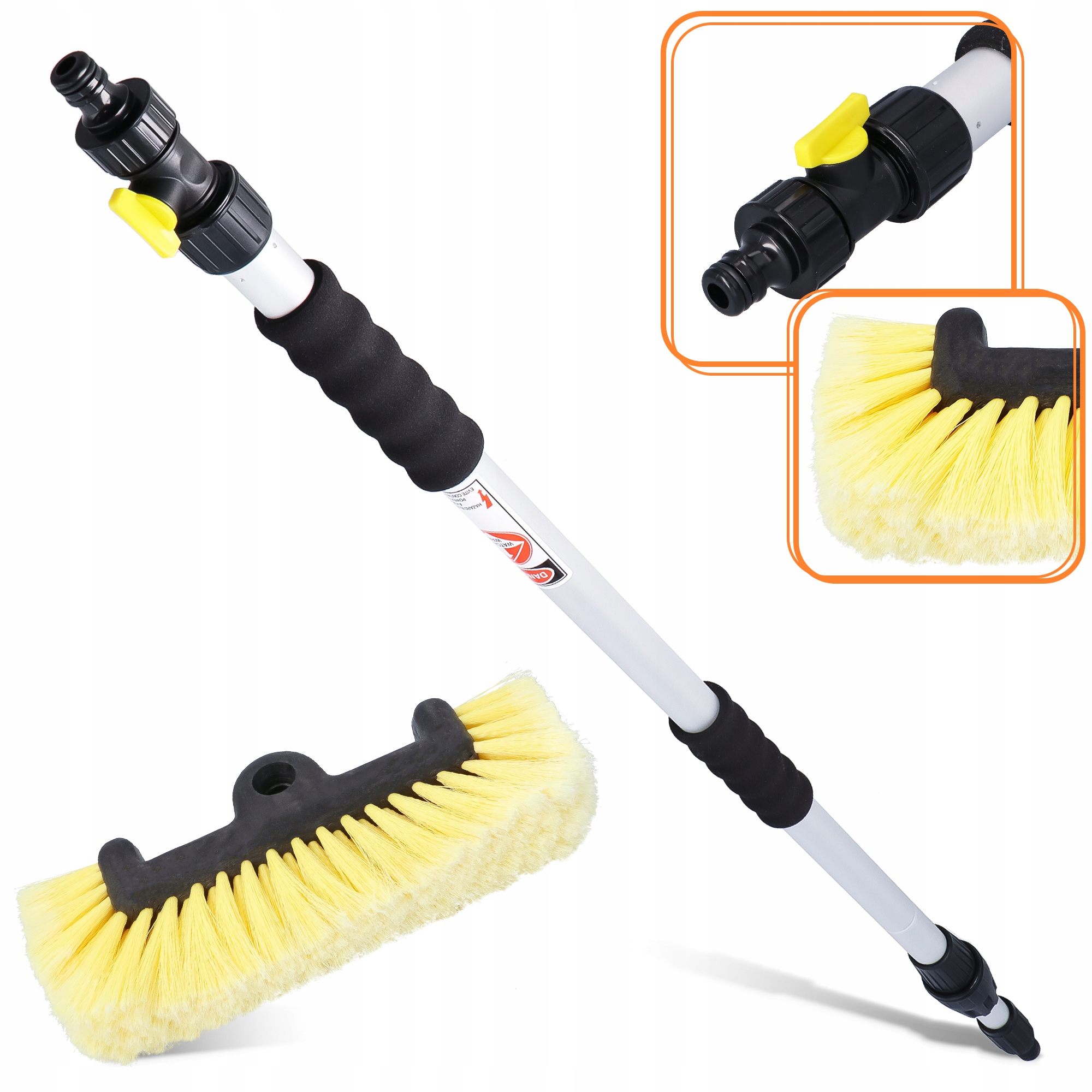 Ця пензлик має телескопічний вал із світлого, але міцного алюмінію. Завдяки регульованій довжині ручки, ви можете легко дістатися до місць без особливих зусиль. Перемикач водного потоку дозволяє простим керуванням промиванням, а кінець швидкого з'єднання дозволяє швидко та простим підключенням до шланга.