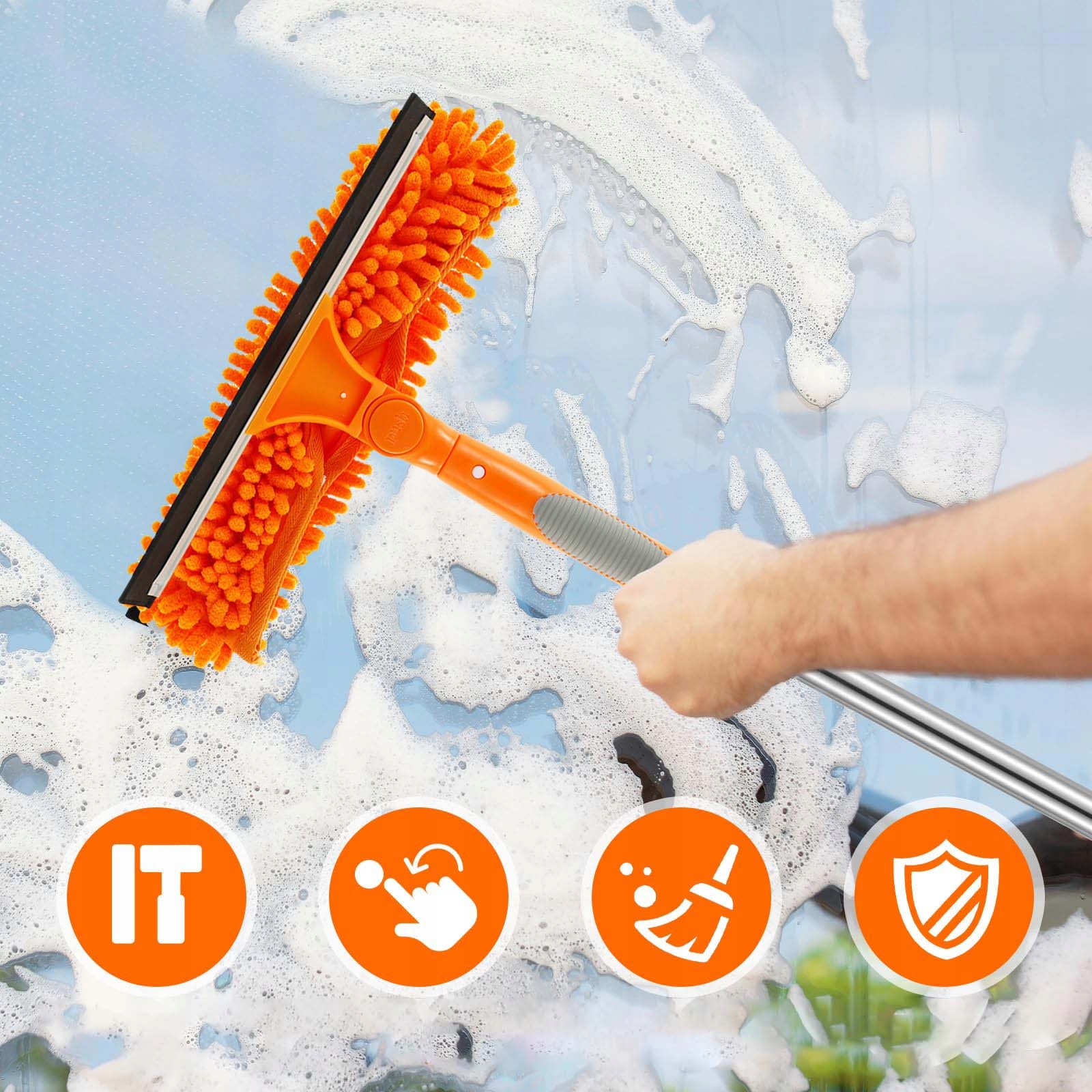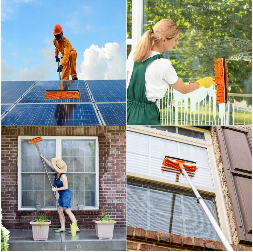 Цей ракель для миття вікон постачається з тканиною з мікрофібри, синелі, рифленою щіткою та скребком, ідеально підходить для чищення скла, вікон, скляних душових дверей, стін, дзеркал, автомобілів скло, внутрішні та зовнішні вікна високої чистоти, автомобільне скло, сонячні панелі, морські та морські скребки тощо.