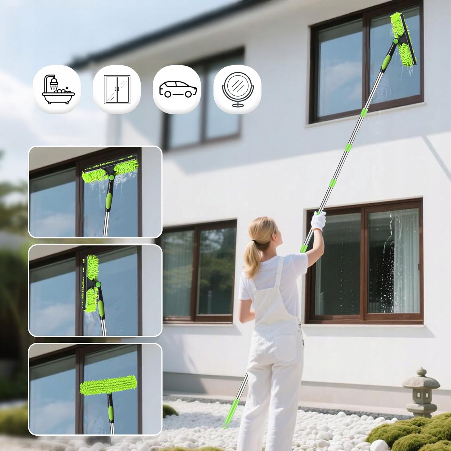 Цей інструмент, який поєднує в собі гумовий скребок і гнучку щітку для пилу, забезпечує ідеальне, індивідуальне прибирання. У набір входять дві змінні серветки для вікон різного розміру, які ефективно відтирають і миють як високі, так і низькі вікна.