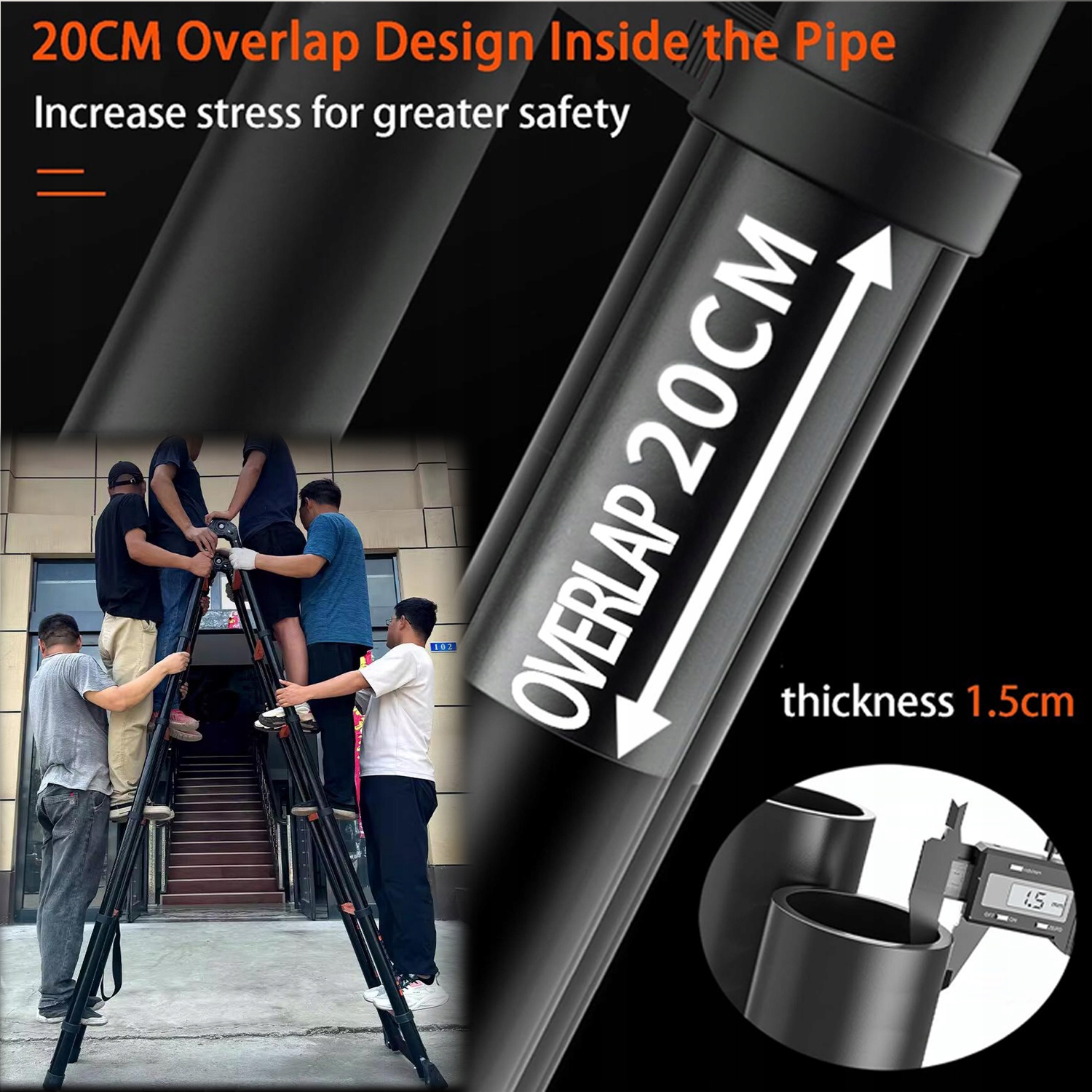 . Використовуючи схему фізичного тиску, кожна секція товстої алюмінієвої труби перекривається на 20 см, збільшуючи площу поверхні напруги, що призводить до більш рівномірного навантаження та більш стабільної опори. Драбина виготовлена з корозійностійкої високоякісної вуглецевої сталі та може витримувати навантаження до 150 кілограмів. Товстий і міцний метал запобігає появі вм'ятин та інших деформацій під час звичайного використання.