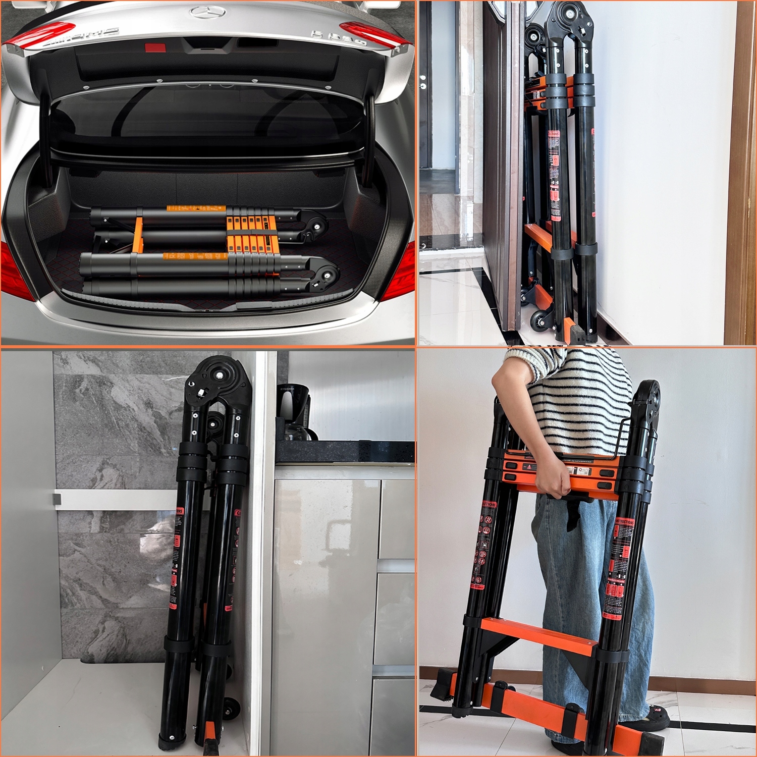 У складеному вигляді ця драбина має лише 105 см. Невеликий розмір цієї міцної драбини дозволяє легко зберігати її в машині, гаражі, сараї або в інших обмежених приміщеннях. Завдяки своїм компактним розмірам цю драбину також можна легко переміщати та транспортувати з одного робочого місця на інше. Драбина також легка, важить всього 15 кг. Закріпіть закриту драбину міцним ременем для зручного зберігання та транспортування.