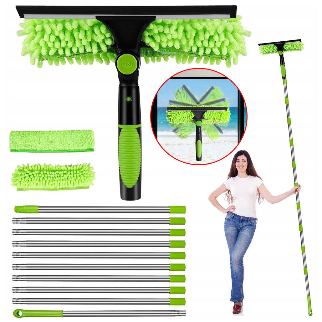 гумовий скребок і пил в одному, з гнучкою очисною головкою для ідеальних результатів прибирання. У набір входять дві змінні ганчірки для миття вікон різних розмірів для ефективного чищення високих і низьких вікон.