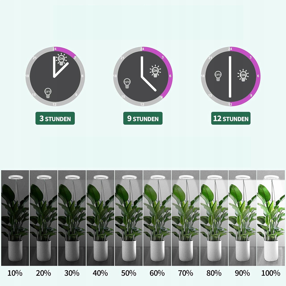 🌱 Автоматичний час увімкнення/вимкнення:Лампа для рослин YOUKUKE має функцію таймера, яка дозволяє встановити час увімкнення/вимкнення на 3 години, 9 годин або 12 годин на день. Це гарантує, що рослини отримають потрібну кількість світла та захищені від надмірного освітлення.