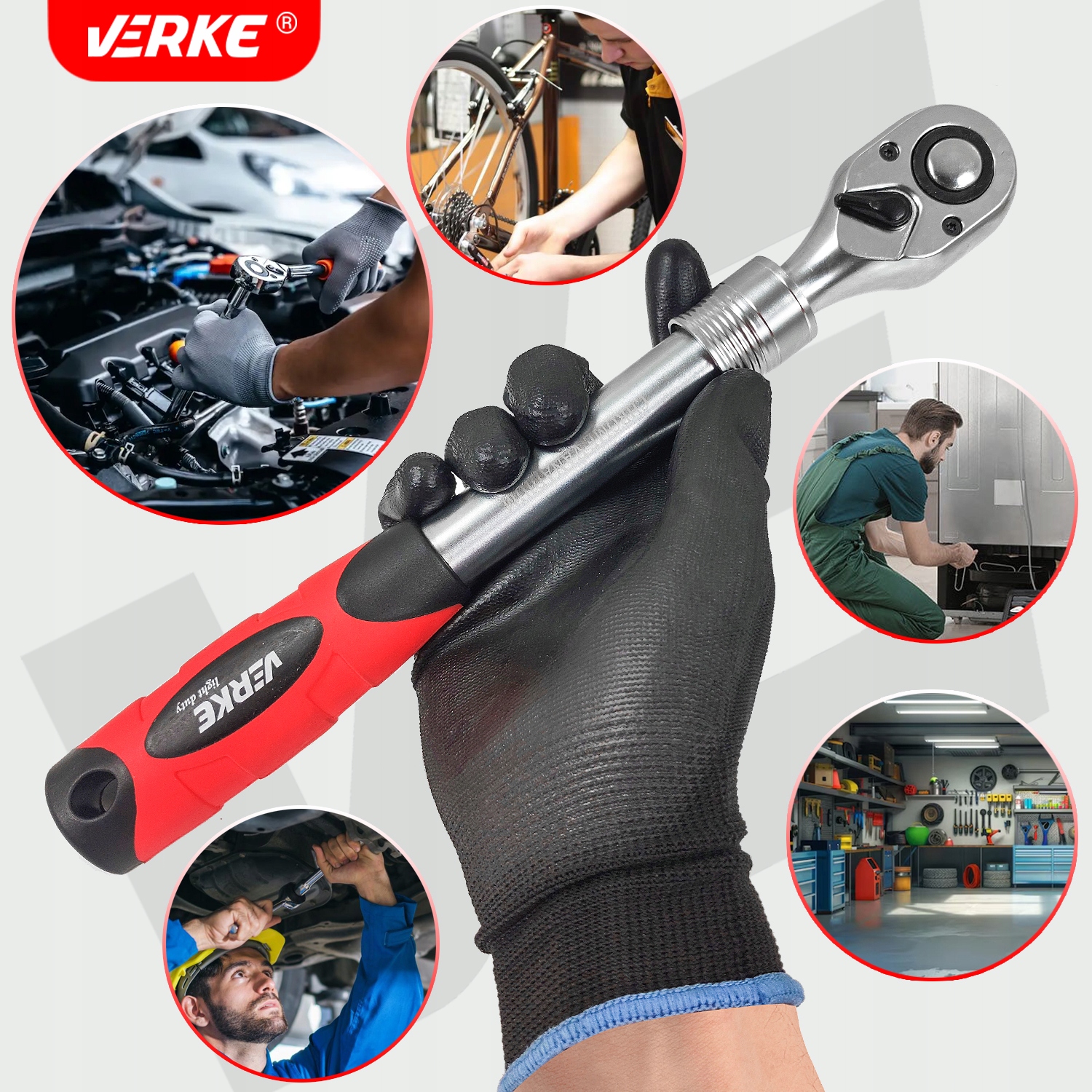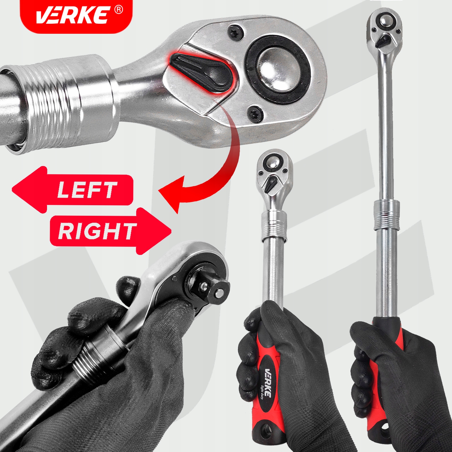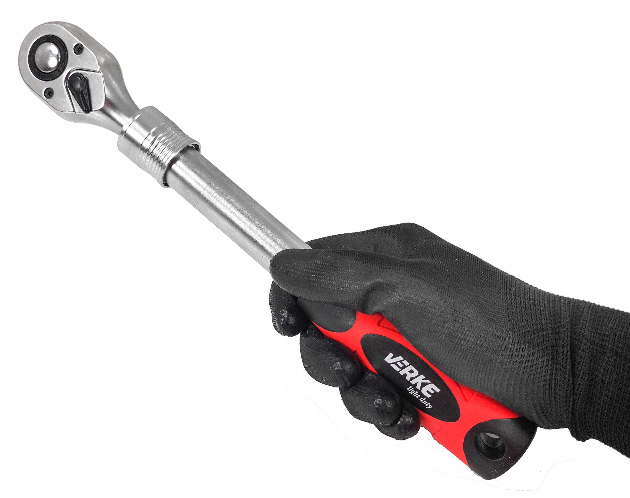ТРАЩАЧКА 1/2″ EXTENDABLE LONG VERKE Light Duty. Ручка виготовлена з хром-ванадієвої легованої сталі. Висока ергономічність роботи досягається завдяки пластиковому каркасу ручки. Ручка має спеціальний профіль у передній зоні захоплення, тому вона надійно лежить у руці. Хромована, полірована поверхня.