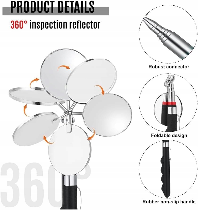 Оглядове дзеркало, що обертається на 360, має конструкцію поворотного штифта на 360 для гнучкого обертання та забезпечує розпізнавання багатьох елементів. Цільна конструкція, що кріпиться на болтах, міцна та портативна. Високоякісний матеріал Наші автомобільні дзеркала виготовлені з високоякісних матеріалів з антикорозійним покриттям на поверхні, що робить їх міцними та довговічними та придатними для повторного використання протягом тривалого часу. Телескопічна конструкція Оглядове дзеркало має телескопічну структуру, а телескопічну штангу можна подовжити від 95 до 29. Довжину телескопічної штанги оглядового дзеркала можна регулювати відповідно до ваших потреб, що легко використовувати. У комплект поставки ви отримаєте набір із 6 телескопічних дзеркал, яких достатньо для різних ситуацій. Круглі оглядові дзеркала мають діаметр 2, а загальна довжина – до 29. Захист від ковзання Детектор виготовлено з високоякісного гумового матеріалу, відлитий зануренням, щоб запобігти ковзанню, і дуже міцний.