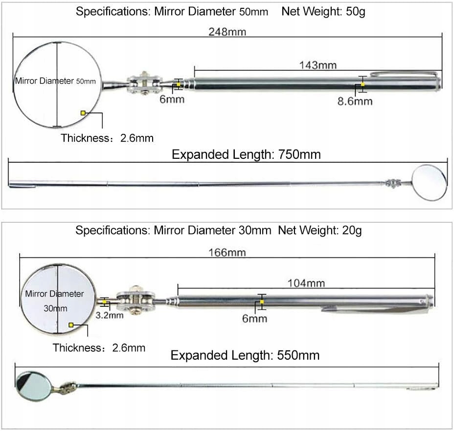 Дзеркало, що обертається на 360 градусів, і регульована довжина Складне телескопічне дзеркало можна розсунути в будь-які тісні місця, оскільки стрижень оглядового дзеркала становить до 1455 см. На вибір є дзеркала діаметром 30 мм і 50 мм. Розсувне дзеркало можна повертати на 360 градусів і забезпечує гнучке та чітке відображення. Робота вдома дає змогу обшукувати вузькі місця у вашому домі, щоб знайти втрачені речі та перевірити внутрішню частину гітари чи інших інструментів. Наше розкладне дзеркало також ідеально підходить для дому. Високоякісна нержавіюча сталь і легкий стрижень з нержавіючої сталі зі зручною рукояткою з пінопласту та кришталево прозорі відбиваючі дзеркала з нержавіючої сталі є основою тривалого терміну служби. Ми постійно прагнемо запропонувати найкращий продукт кожному клієнту. Міцний поворотний кульовий шарнір. Наше оглядове дзеркало добре сконструйоване та доступне за ціною, шарнір досить міцний, щоб дзеркало не гойдалося, а ручка м’яка на дотик. Робота в майстерні Завдяки тонкому висувному валу з поворотним дзеркалом можна легко побачити приховані деталі двигуна, зняти показання важкодоступних газових лічильників, перевірити індикатор наповнення або натягу приводного ременя. Ідеальне рішення для газових та електромонтажників для перевірки з’єднань труб після спаювання та перевірки на герметичність.