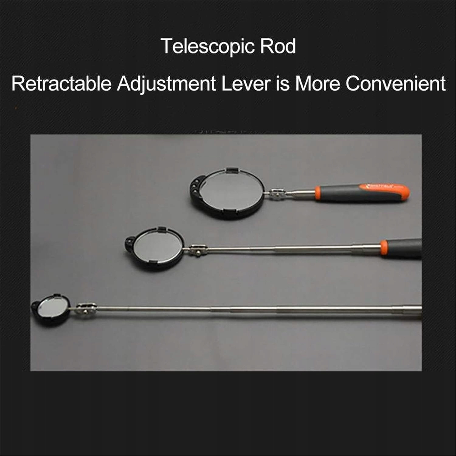 ЕКОНОМІЯ ЧАСУ Система телескопічних оглядових дзеркал ідеально підходить для пошуку під капотом вашого автомобіля або пошуку предметів у вузьких і тісних місцях. Знайдіть загублену річ під диваном або вирішіть надокучливу проблему руху. МАТЕРІАЛИ ВИСОКОЇ ЯКОСТІ Основний корпус оглядового дзеркала виготовлено з нержавіючої сталі, а поверхня дзеркала виготовлена з вибухобезпечного сріблястого дзеркального матеріалу, який є міцним і стійким до корозії. Низ телескопічної ручки обгорнутий м'якою гелевою прокладкою. Міцна рама та м’яка рукоятка забезпечують міцне захоплення щоразу. СВІТЛОДІОДНІ ЛІХТАРІ. Конструкція зі світлодіодними ліхтарями, що обертається на 360 градусів, дозволяє перевіряти розташування дефектів автомобіля під різними кутами, не впливаючи на лінію видимості, що дуже практично. ЗРУЧНІСТЬ Міцний поворотний візок на колесах і регульована ручка дозволяють офіцеру служби безпеки легко перевіряти під транспортним засобом, не нахиляючись і не втрачаючи концентрації на перевірці. ПОТРІБНИЙ ПРОСТОР 10 см 4 дюйми під автомобілем або вантажівкою для безперебійної роботи.