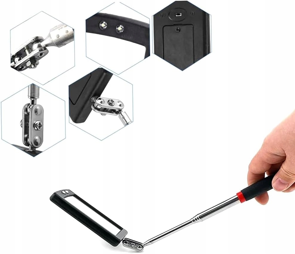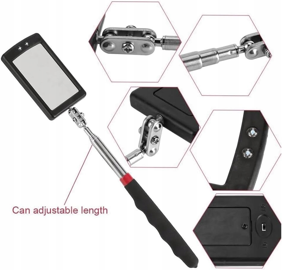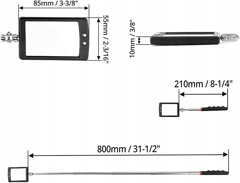 2 прямокутних дзеркала розміром 25 x 17 довжина в розкладеному стані 34 довжина в складеному вигляді 75 4. Телескопічні оглядові труби можна зберігати в гаражі, ящику для інструментів, машині, комоді, сумці для одягу або де завгодно, ви також можете подарувати його як подарунок вашій сім'ї тощо. 1. Оглядове дзеркало - хороший інструмент для ваших потреб у огляді. За допомогою телескопічної палиці ви можете регулювати довжину ручної палиці під свої потреби, її зручно переносити і зберігати, нашийне дзеркало можна повертати на 360 градусів, що полегшує спостереження за важкодоступними місцями. 3. Оглядові дзеркала ідеально підходять для виробників інструментів, механіків, інспекторів, а освітлювальні прилади для механіків роблять його особливо корисним у темних і важкодоступних місцях Оглядове дзеркало постачається з батарейками CR2032 зручна пластикова ручка з м’якою нековзкою гумовою рукояткою 5. Універсальне використання Телескопічне оглядове дзеркало LED може легко допомогти вам знайти падаючі предмети. Це практичний аксесуар для ремонту автомобіля, катання на човні, кемпінгу, риболовлі та для будь-якої скриньки для інструментів, а також як несподіваний подарунок на дні народження, День святого Валентина, День батька, Різдво тощо.