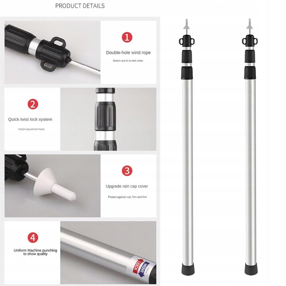 - Алюмінієвий матеріал високої якості, висока твердість, стійкість до зносу, нелегка пошкодження та деформація, відмінні засоби для шліфування, можуть бути закріплені та скорочуватися, повернути ліворуч і праворуч. Дощах значно покращив практичність, професійно використовується у великих повітряних наметах, високу стійкість до вітру, гнучкий, довжина продукту 90-230 см з 3 секціями, діаметром зовнішньої щоглі 21-30 мм