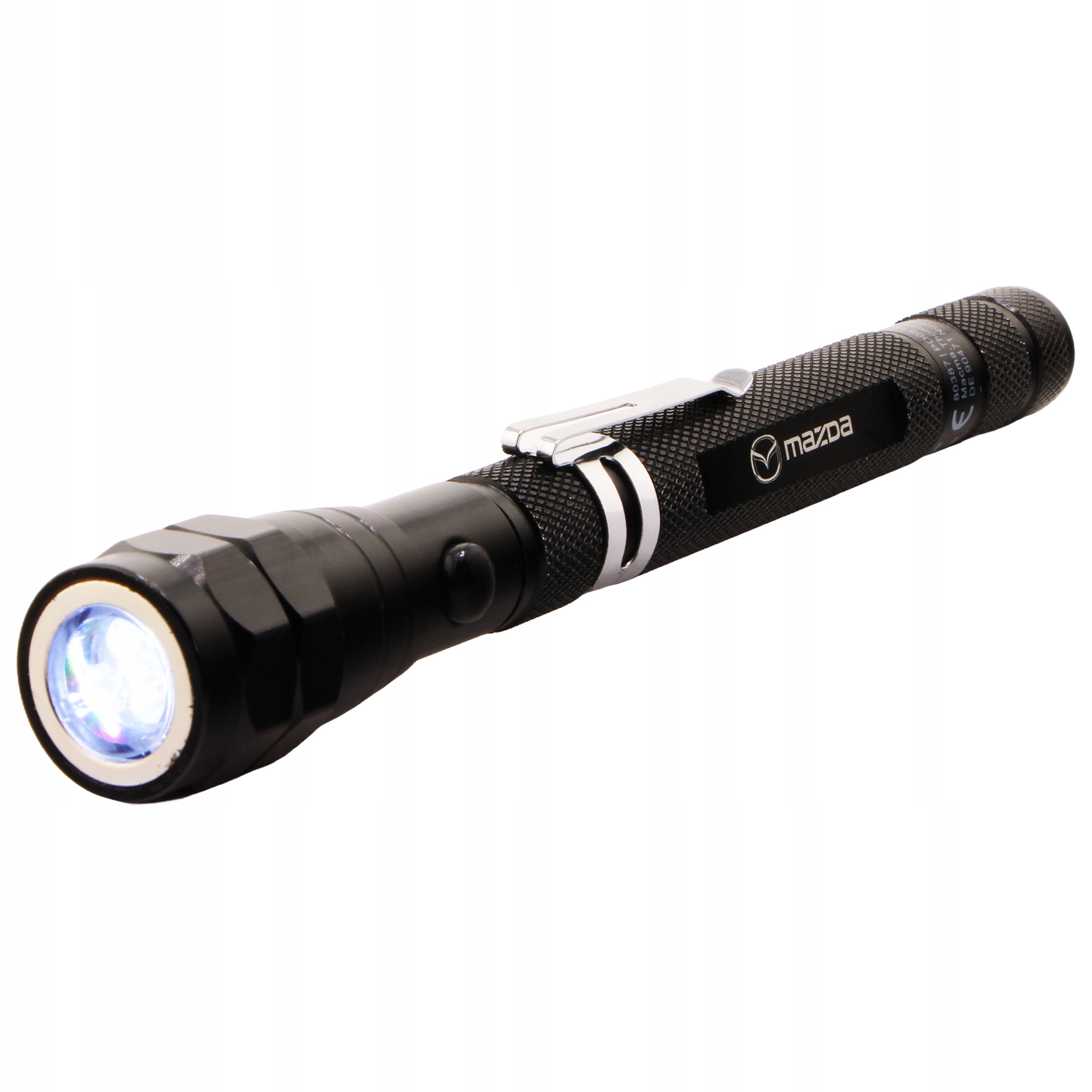 - Металевий телескопічний ліхтарик у чорному кольорі з білим логотипом Mazda