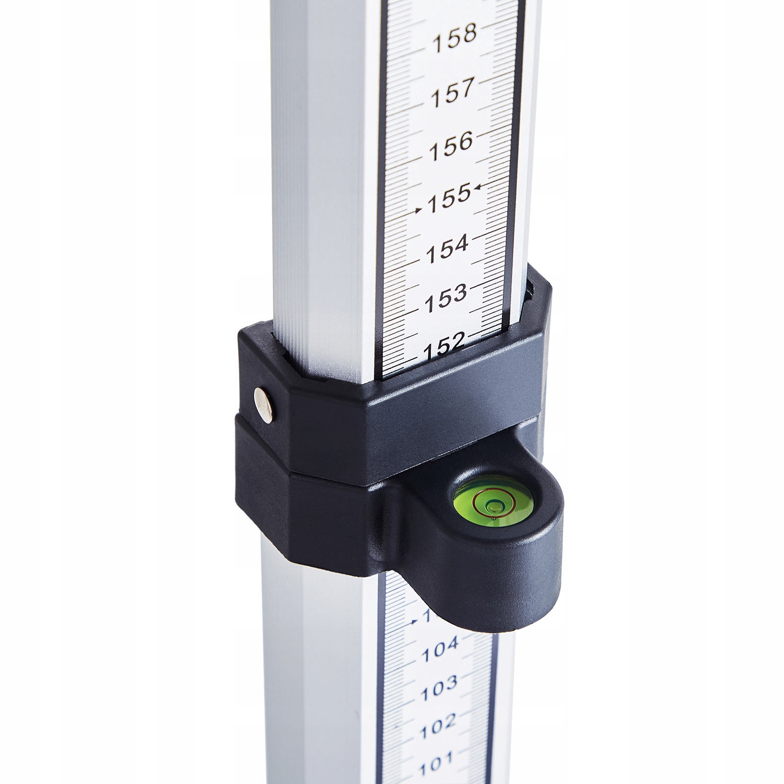 Цей рівень швидко вимірює загальну висоту за допомогою шкал, стійких до атмосферних впливів та корозії, і червоних позначок на ніжках для максимальної видимості та чітких показань.