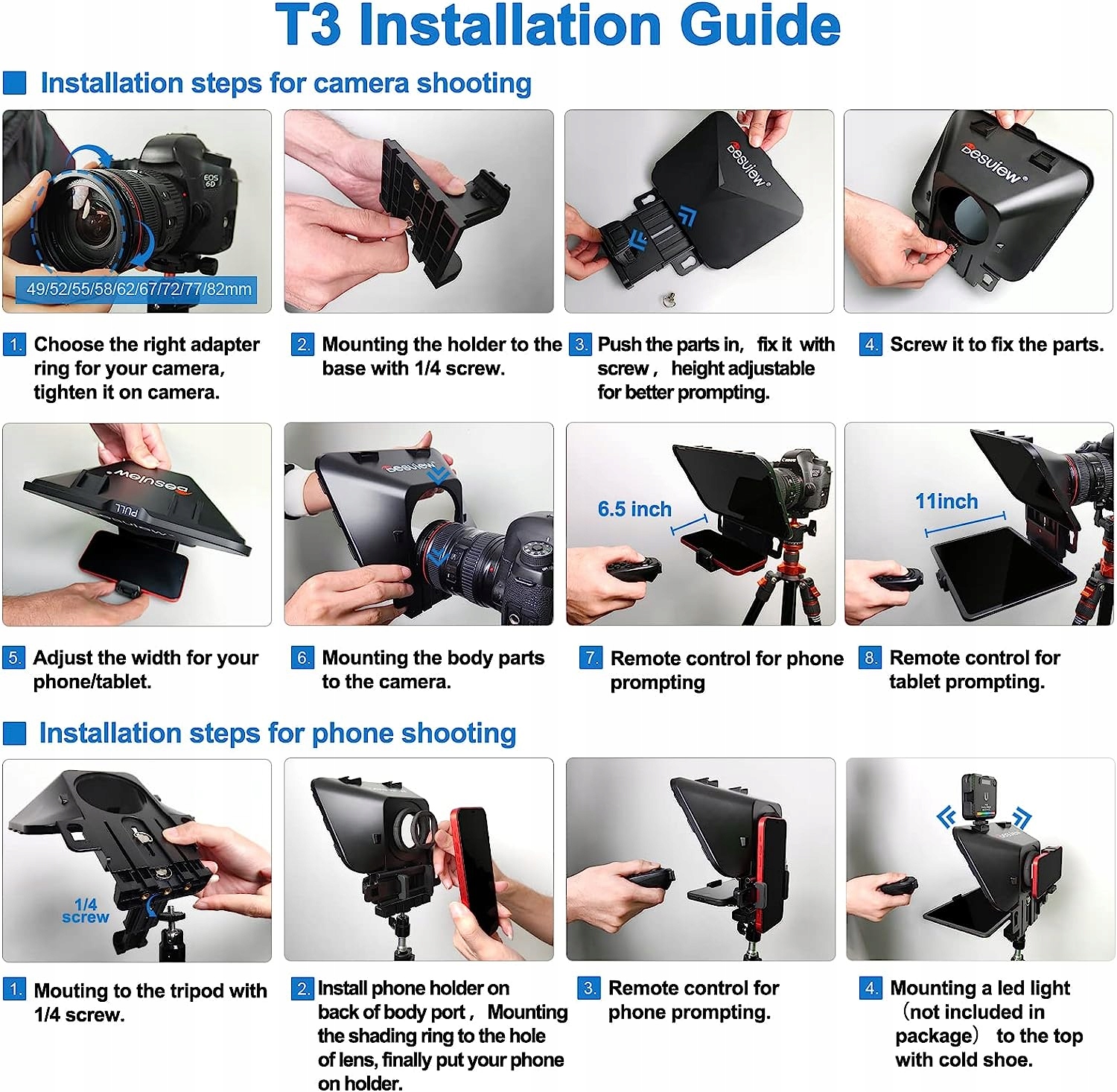 - Телесуфлер шириною 28 см: Телесуфлер Desview T3 призначений для зйомки цифровими дзеркальними фотоапаратами/фотокамерами/смартфонами; телесуфлери можуть підтримуватися для iPad до 11 дюймів, планшетів і телефонів аналогічного розміру; Телесуфлер iPad має вбудовані 2 кріплення холодного башмака на верхній частині, які можуть монтувати заповнювачі та мікрофони.