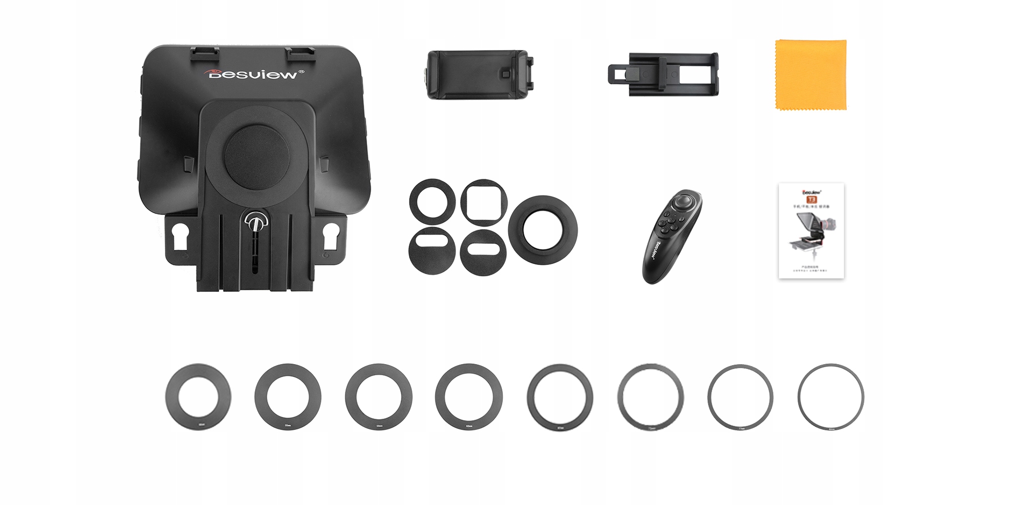 У комплекті з телесуфлером Desview T3 є аксесуари, які дозволять зручно записувати відео за допомогою різних пристроїв. Спеціальний тримач дозволить зручно записувати зображення за допомогою смартфона, прикріпленого до лівої або правої сторони телесуфлера. Виробник також передбачив спеціальні кільця з поролону, що затемнюють, завдяки чому отвір підійде до багатьох моделей мобільних пристроїв. Якщо ви використовуєте різні об’єктиви, під’єднані до бездзеркальної камери, дзеркальної фотокамери чи відеокамери, просто виберіть відповідне кільце зменшення. У наборі їх цілих 9 штук, тому з телесуфлером підійде практично будь-яке скло.