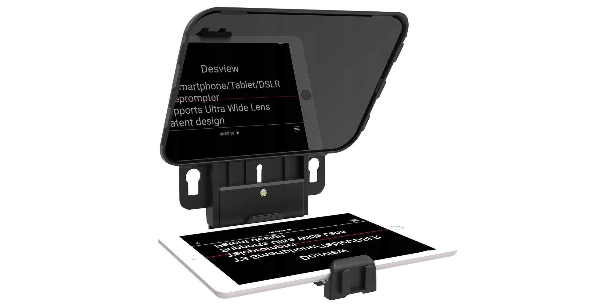 У телесуфлері Desview T3 використовується високоякісне 26-шарове скло, яке розділяє світловий промінь (70/30). Забезпечує високу проникність 97%. Завдяки таким параметрам відсутній ефект подвійного відображення, а текст, який читається з телесуфлера, чіткий і виглядає майже так само, як якщо б ви читали його прямо з екрану смартфона.