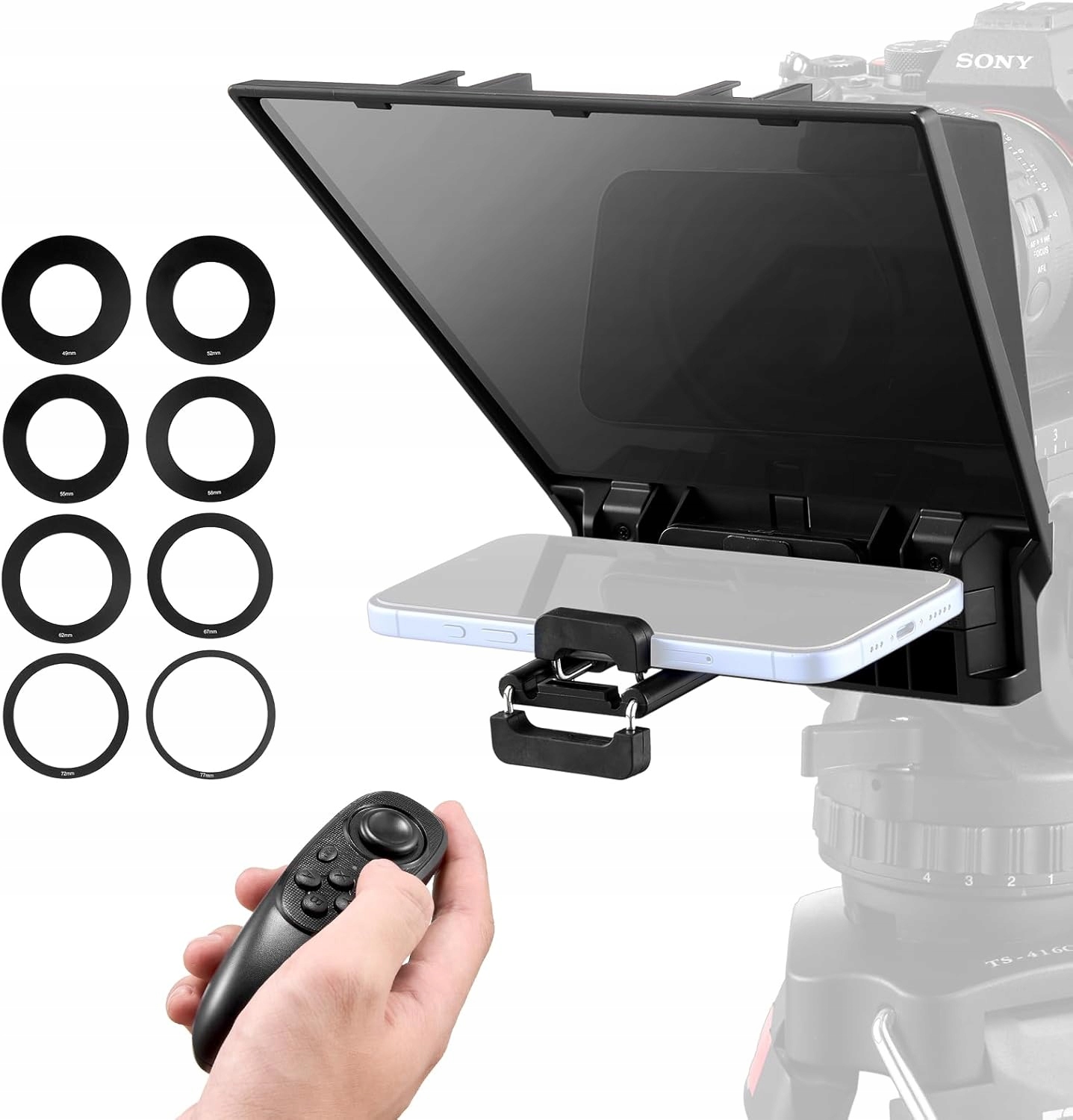 Компактний універсальний телесуфлер — це модульний інструмент для використання як у домашніх, так і в професійних студіях звукозапису. Скло, що працює за принципом одностороннього дзеркала, призначене для відображення тексту, що відображається на телефоні, встановленому внизу, і спрямовує зображення прямо на мовця. Відбитий текст відображається лише з одного боку і залишається невидимим для записуючого пристрою (камери). У результаті виконавець залишається в постійному зоровому контакті з камерою (глядачем), вільно розмовляє, не дивлячись на ноти чи запам’ятовуючи великі фрагменти тексту. Що важливо, лист не спотворює зображення і не впливає негативно на роботу камери. Покриття з чорного матового матеріалу, що оточує його, ефективно зменшує потенційні відблиски, що позитивно впливає на якість відображуваного тексту, а також полегшує роботу на відкритому повітрі.