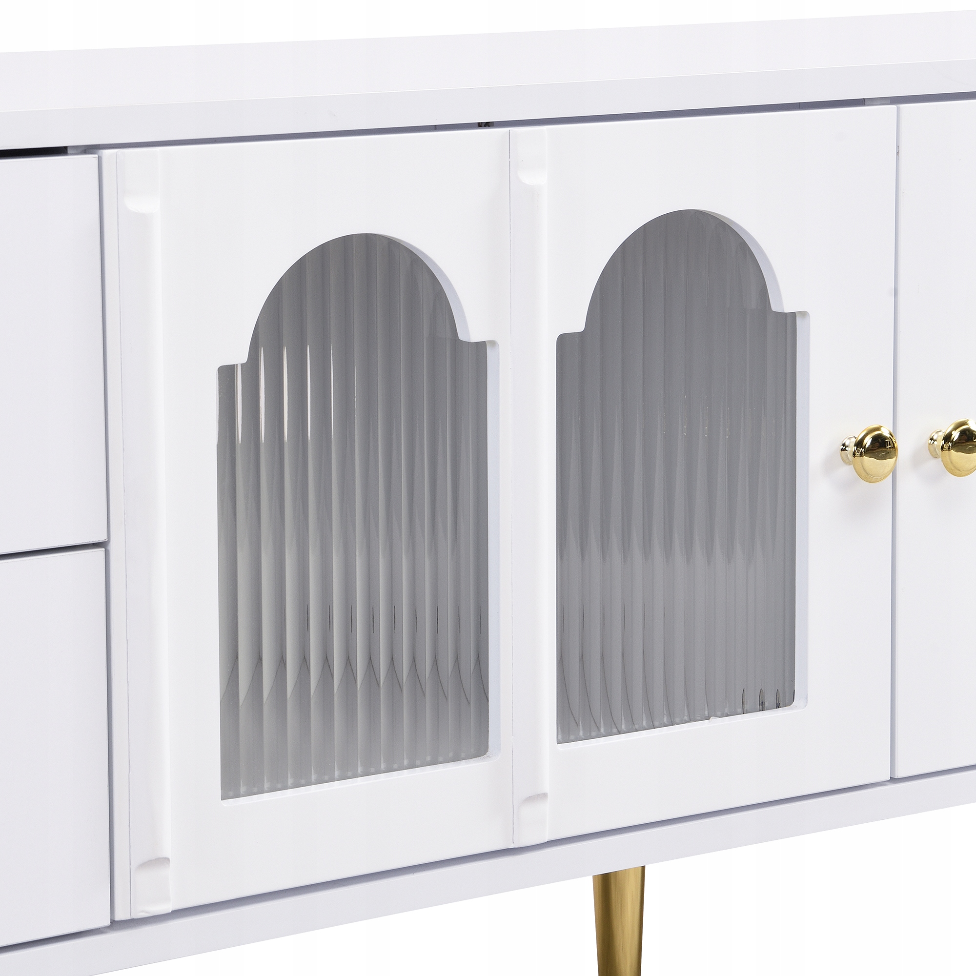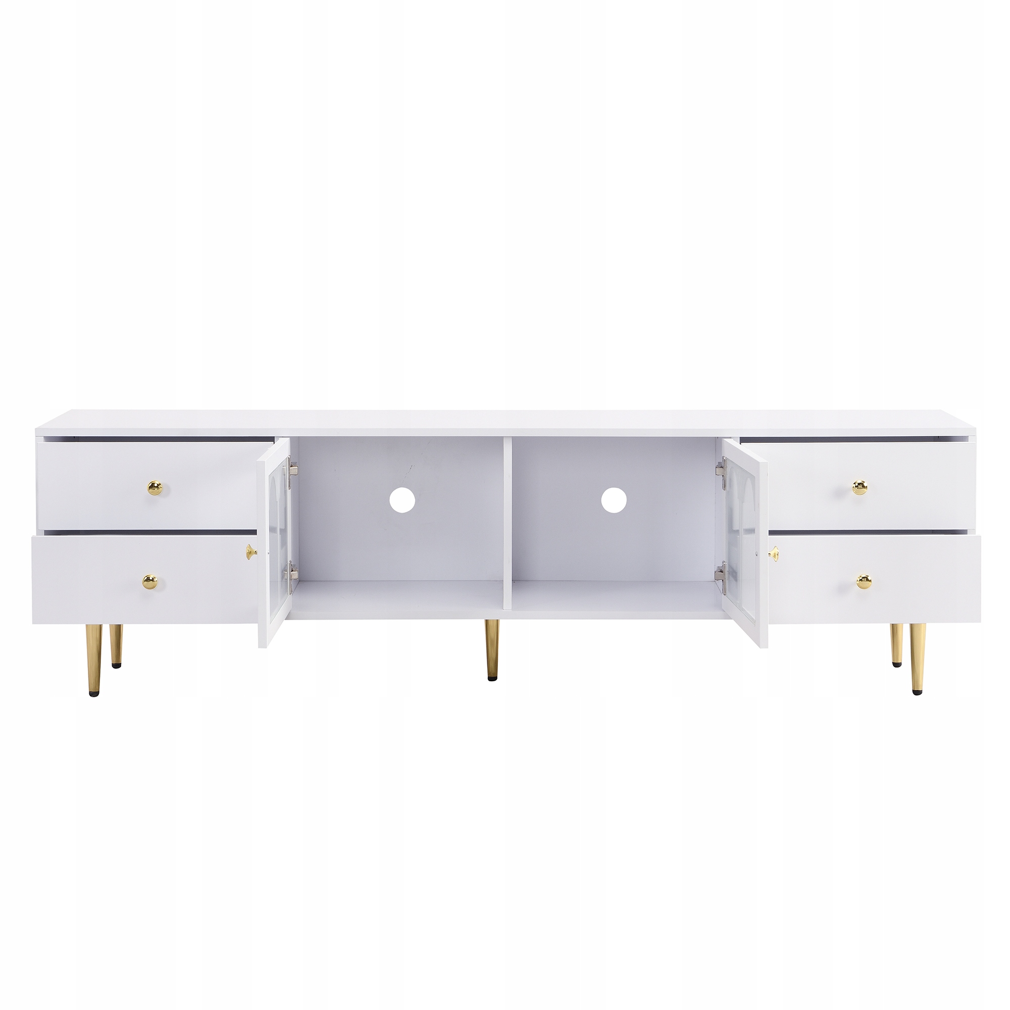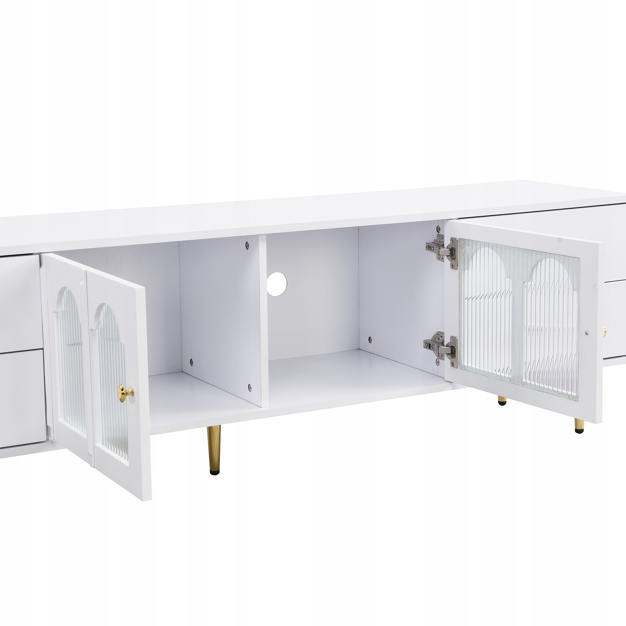 Телевізійна шафа, зігнуті скляні двері, золоті ручки та ноги, ящики