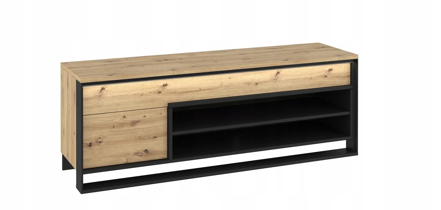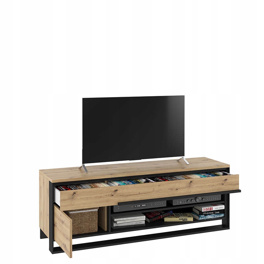 Широка тумба під ТВ в сучасному стилі лофт. Тумба призначена для зручного зберігання мультимедійного обладнання, колекції компакт-дисків, пультів дистанційного керування та інших дрібниць. Функціональна внутрішня частина з двома нішами, містким ящиком і шафою з дверцятами допомагає підтримувати порядок у всій зоні телевізора.