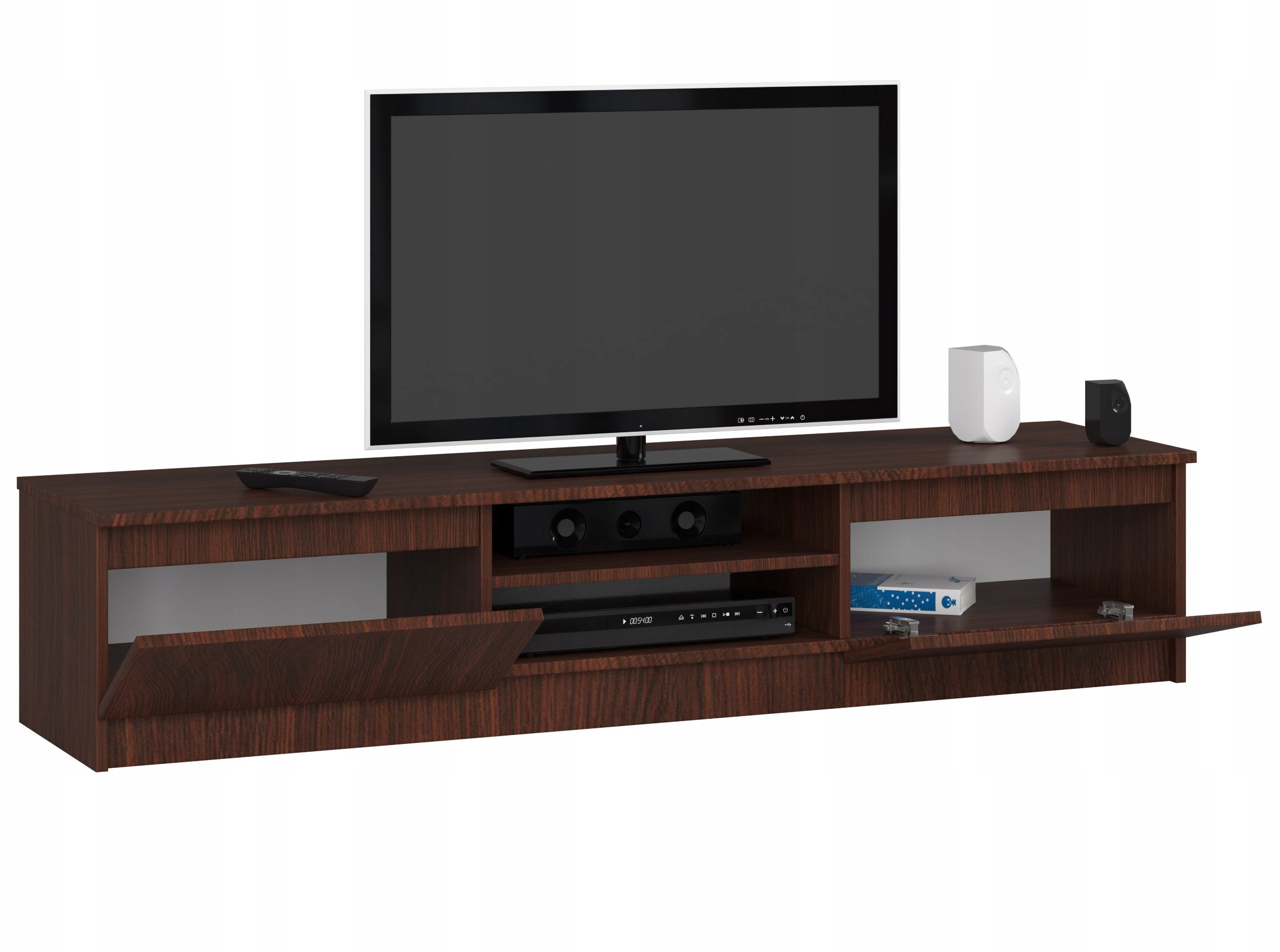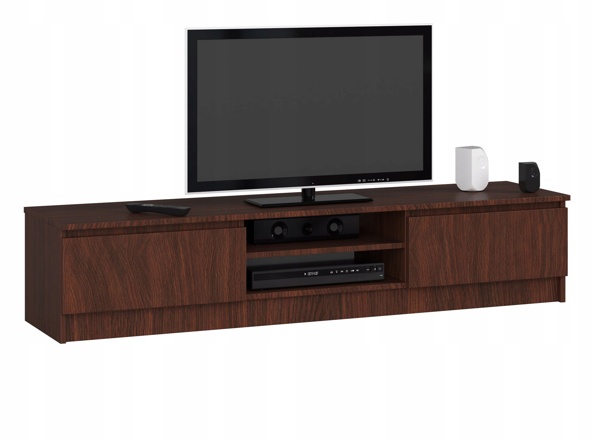 Телевізійна шафа кольору венге має дві полиці, на яких можна вдало розташувати елегантні доповнення, аксесуари, а також такі пристрої, як приставка або консоль і DVD-програвач. Але це ще не все, по обидва кінці тумби під телевізор є дверцята, що ведуть до містких шаф, які вміщають велику кількість документів і аксесуарів. Представлена модель має довжину 160 сантиметрів, тому в ній можна встановити великогабаритні телевізори. До того ж його висота всього 33 сантиметри, тож відпочивати перед телевізором можна під потрібним кутом! Варто додати, що глибина шафи становить 40 сантиметрів.