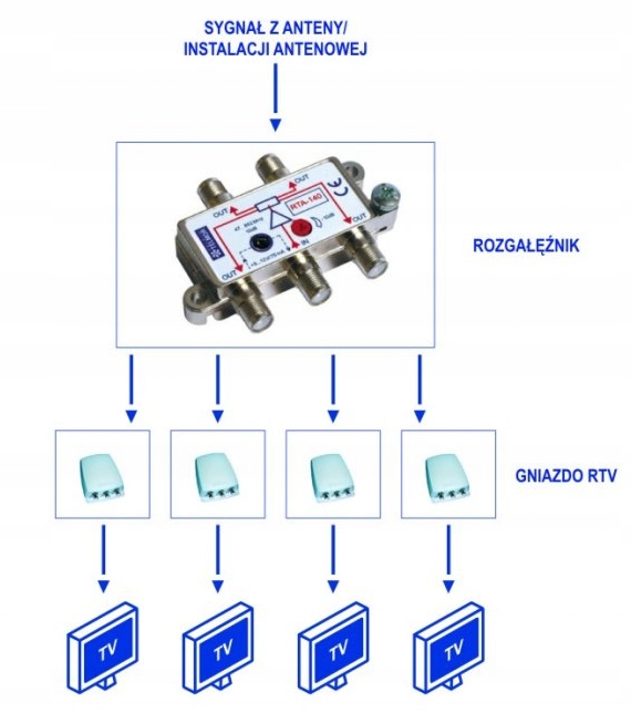 RTA-120 і RTA-140 призначені для роботи в індивідуальних установках розподілу сигналу RTV. Залежно від типу використовуваного розгалужувача, можна живити два або чотири телевізійних приймача антеною або сигналом кабельного телебачення. Кожен тип розгалужувачів має вбудований потенціометр регулювання посилення та перемичку, що дозволяє передавати напругу живлення з позначеного виходу (OUT) на вхід (IN). Розгалужувачі живляться через коаксіальний кабель за допомогою додаткового розділювача напруги.