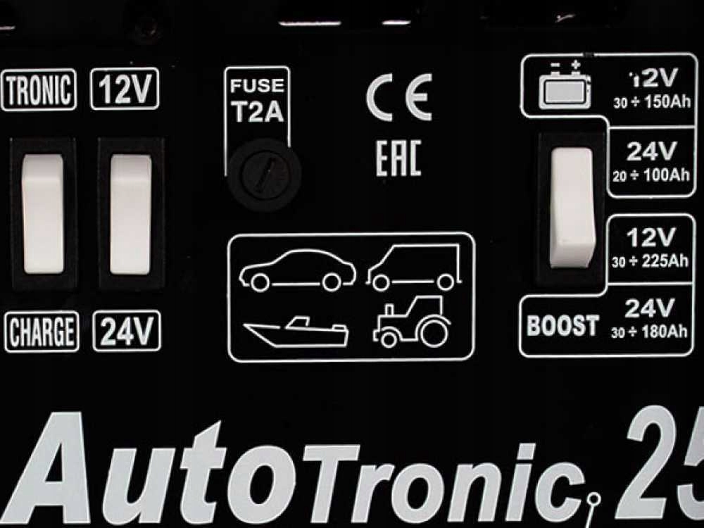 Автомобільний зарядний пристрій Telwin Autotronic 25 Boost є надійним і ефективним зарядним пристроєм і зарядним пристроєм для крапельної зарядки. З електричним контролем зарядного струму, перериванням і автоматичним перемиканням (TRONIC) b> для свинцевих акумуляторів 12-24 В.