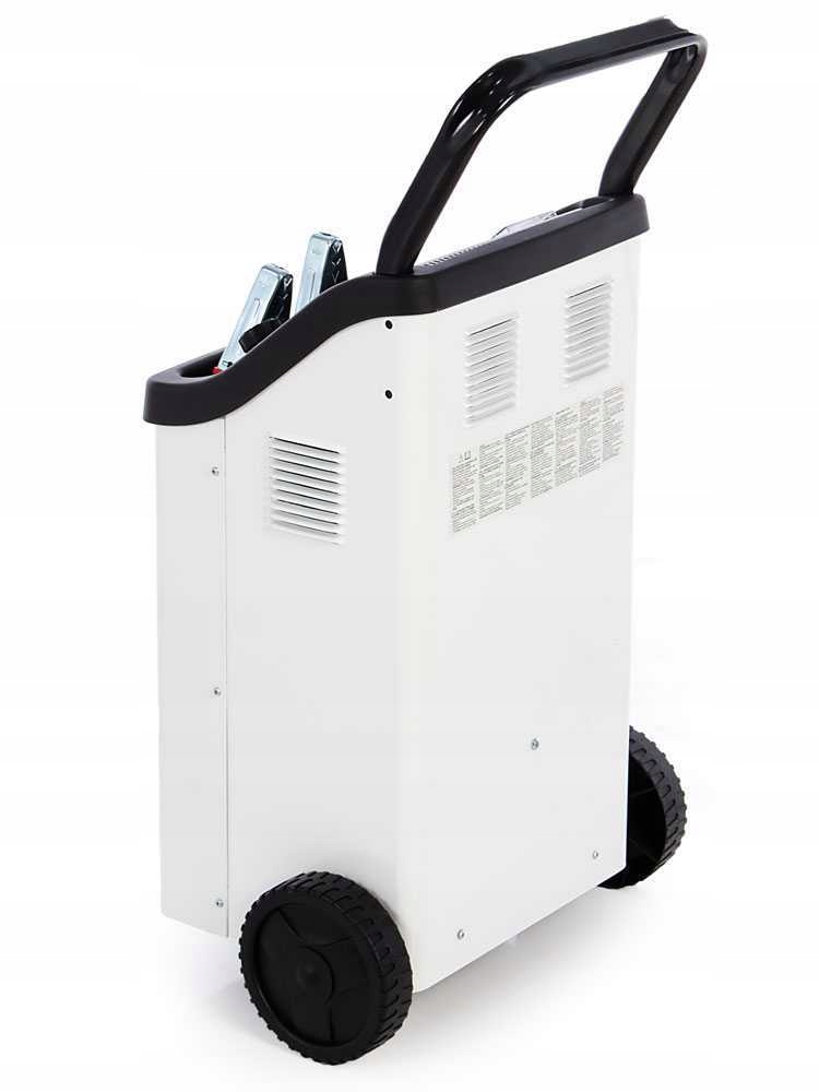 Акумулятор зарядний пристрій із кабелем і вилкою, плюсові (червоні) і мінусові (чорні) кліщі, розташовані на передній полиці. Легкий у використанні та транспортуванні завдяки малій вазі, зручній ручці таколесам, що входять до комплекту.