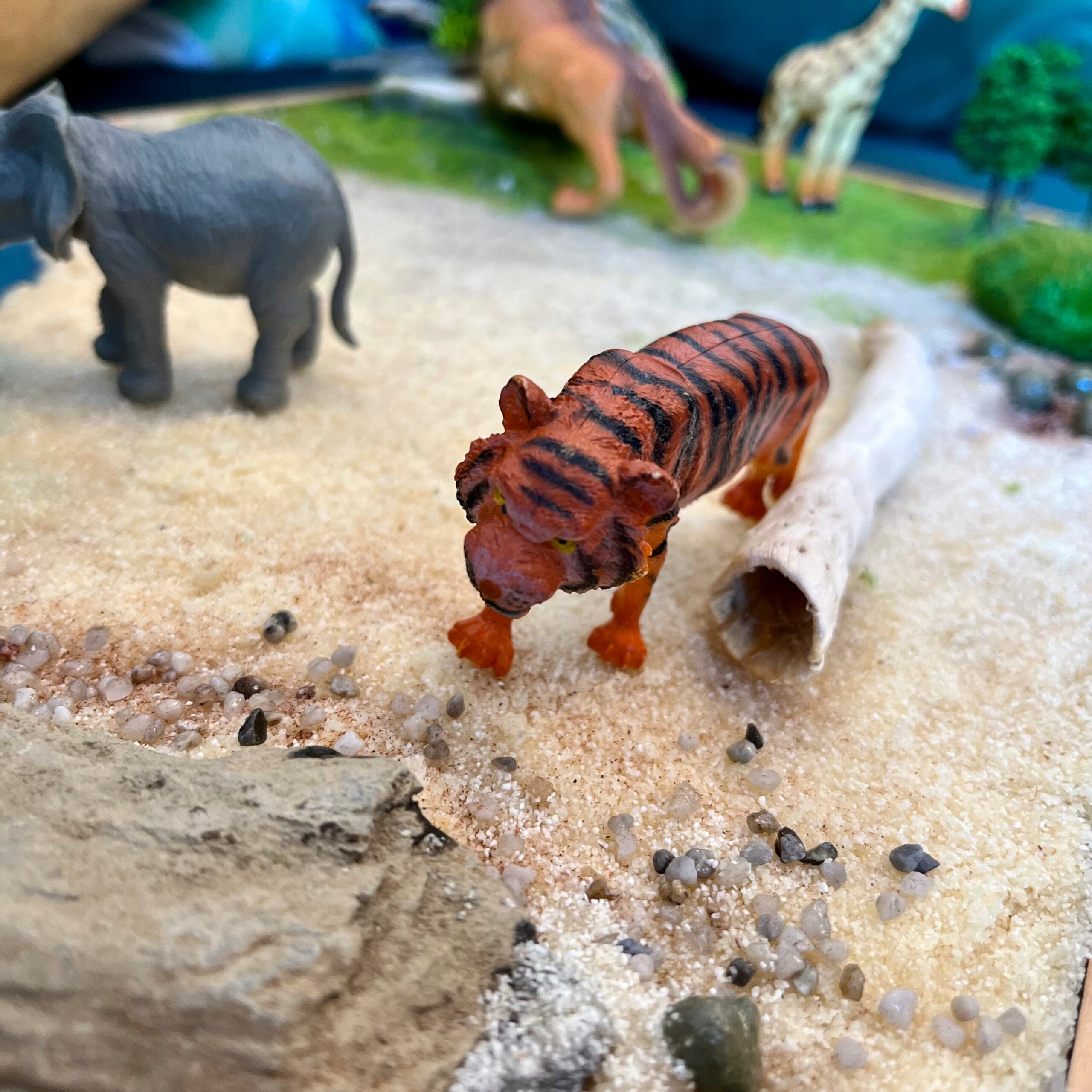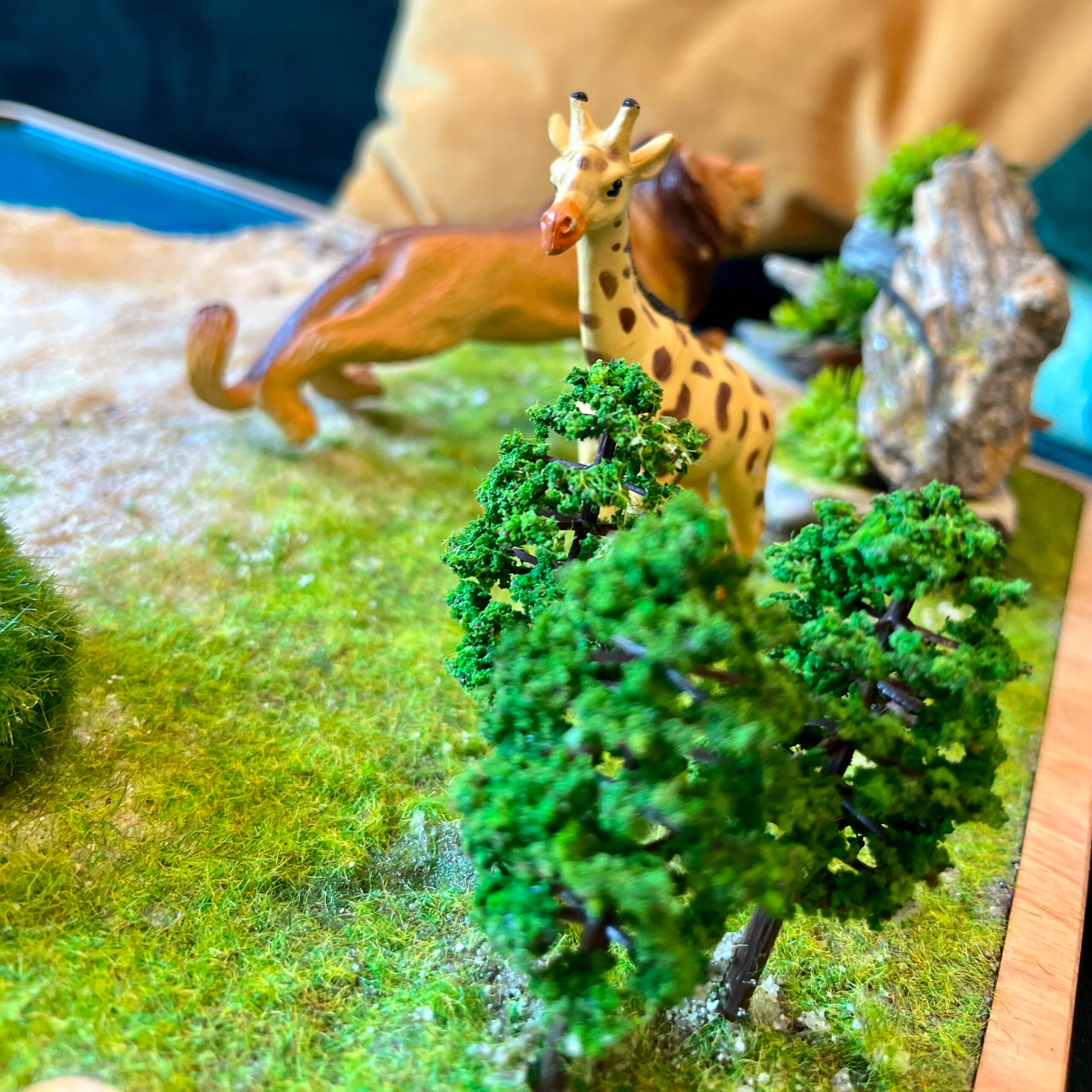 Завдяки цьому дитина може легко перенестися у світ сафарі та пограти з улюбленими тваринами в їх природному середовищі. Тут у нас є вода, з якої можуть пити слони, пісок, по якому може ходити гепард, трава, на якій можуть відпочити жираф і зебра, і камінь/грот, у якому любить відпочити лев.