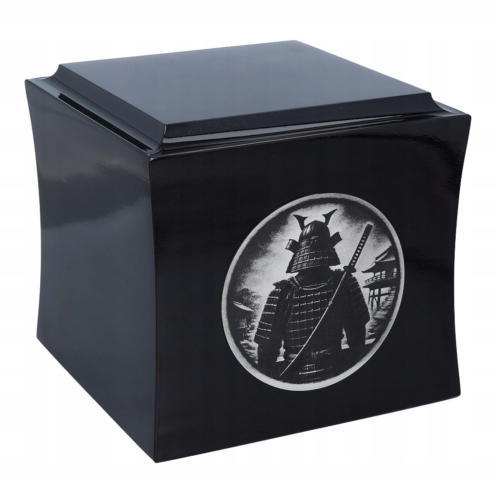 Урна виготовлена з дерева і має форму елегантної коробки, злегка закругленими краями, доступна в чорному або білому кольорі. На передній частині вигравірувано зображення самурая, легендарного японського воїна, який століттями символізував честь, силу та мужність. Відразу над малюнком є персоналізована табличка, на якій ви можете додати ім’я, дати чи особисту присвяту, додаючи особистий і особистий символ до урни.