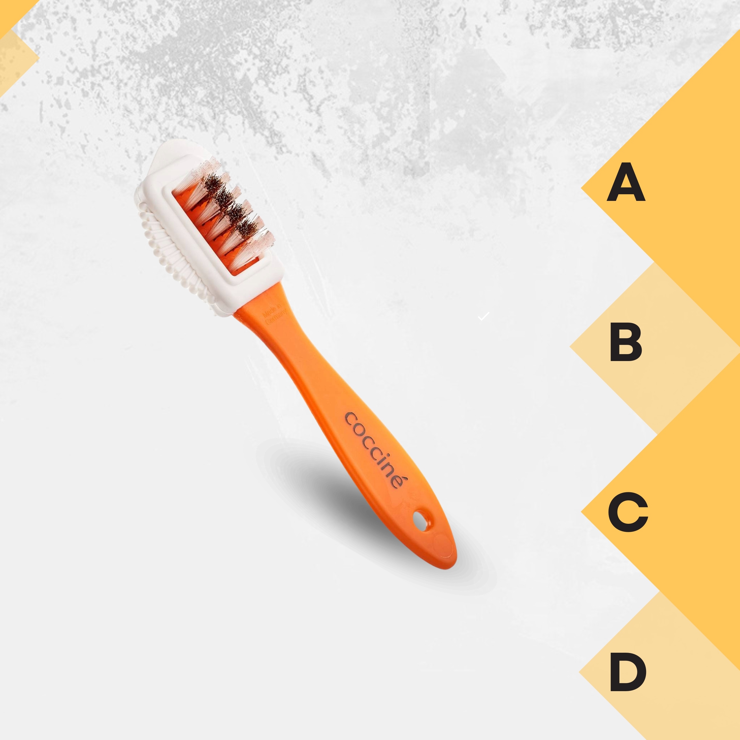 Двостороння щітка Coccine – це практичний інструмент для догляду за замшею та нубуком, який дозволяє швидко та безпечно зняти дбати про зовнішній вигляд свого взуття. Вибирайте перевірений продукт і насолоджуйтеся доглянутим взуттям кожен день!
