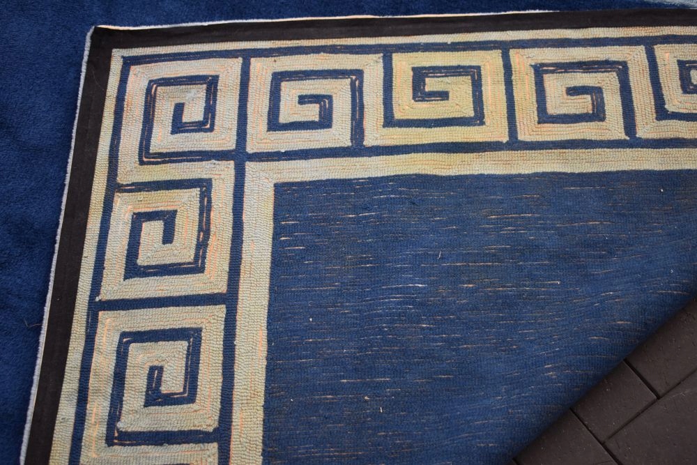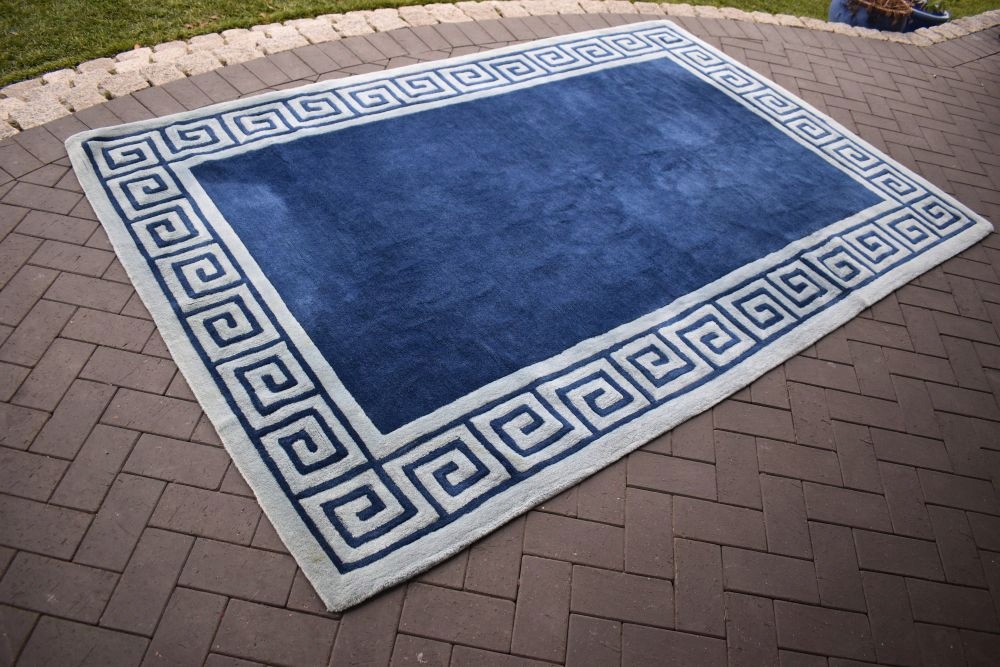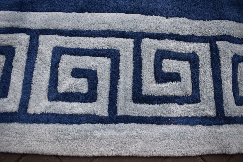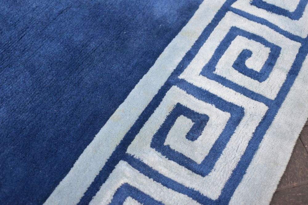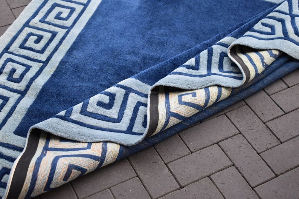 На наступному аукціоні я пропоную вам старий, оригінальний темно-синій китайський старовинний килим, виготовлений вручну з вовни найвищої якості.