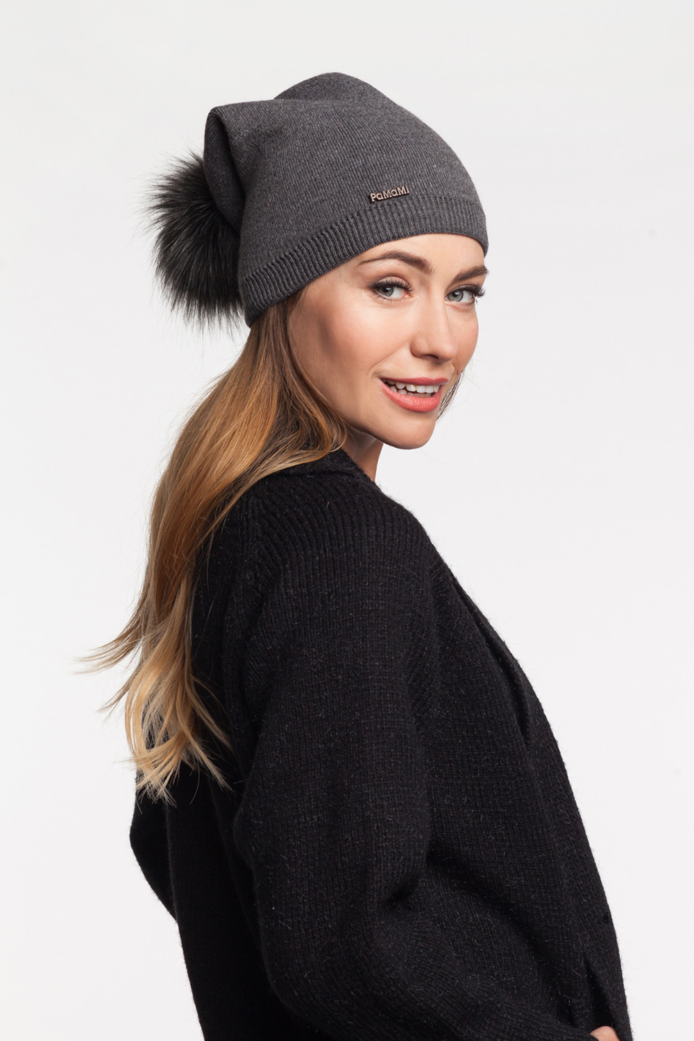 ТЕМНО-СІРИЙ ЖІНОЧИЙ КАПЕЛ З ПОМПОНОМ ЗИМОВІ КАПАХІ