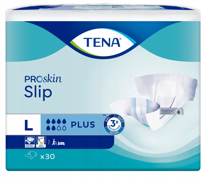 Продукція TENA Slip ProSkin Plus забезпечує потрійний захист від протікання. Технологія FeelDry Advanced, яка використовується в продукті, гарантує швидке вбирання сечі та утримує її від шкіри. Суперабсорбуюча вставка швидко зв'язує навіть велику кількість рідини, забезпечуючи відчуття сухості, а система Odour Neutralizer усуває неприємні запахи. Панель ConfioAir, яка використовується на тильній стороні виробу, дозволяє шкірі дихати. Анатомічна форма виробу забезпечує ідеальне прилягання до тіла, а вбудований індикатор вологи допомагає постійно контролювати рівень зношеності виробу.