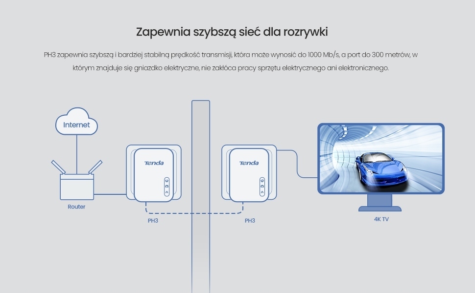 Завдяки вдосконаленій технології AV2 HomePlug AV2, PH3 забезпечує стабільну швидку передачу даних зі швидкістю до 1000 Мб/с на енергетичній лінії, а інтегровані гігабітні порти Ethernet для дротових пристроїв забезпечують повну гігабітну мережу. PH3 надає повну підтримку 4K відео та плавної онлайн -гри.