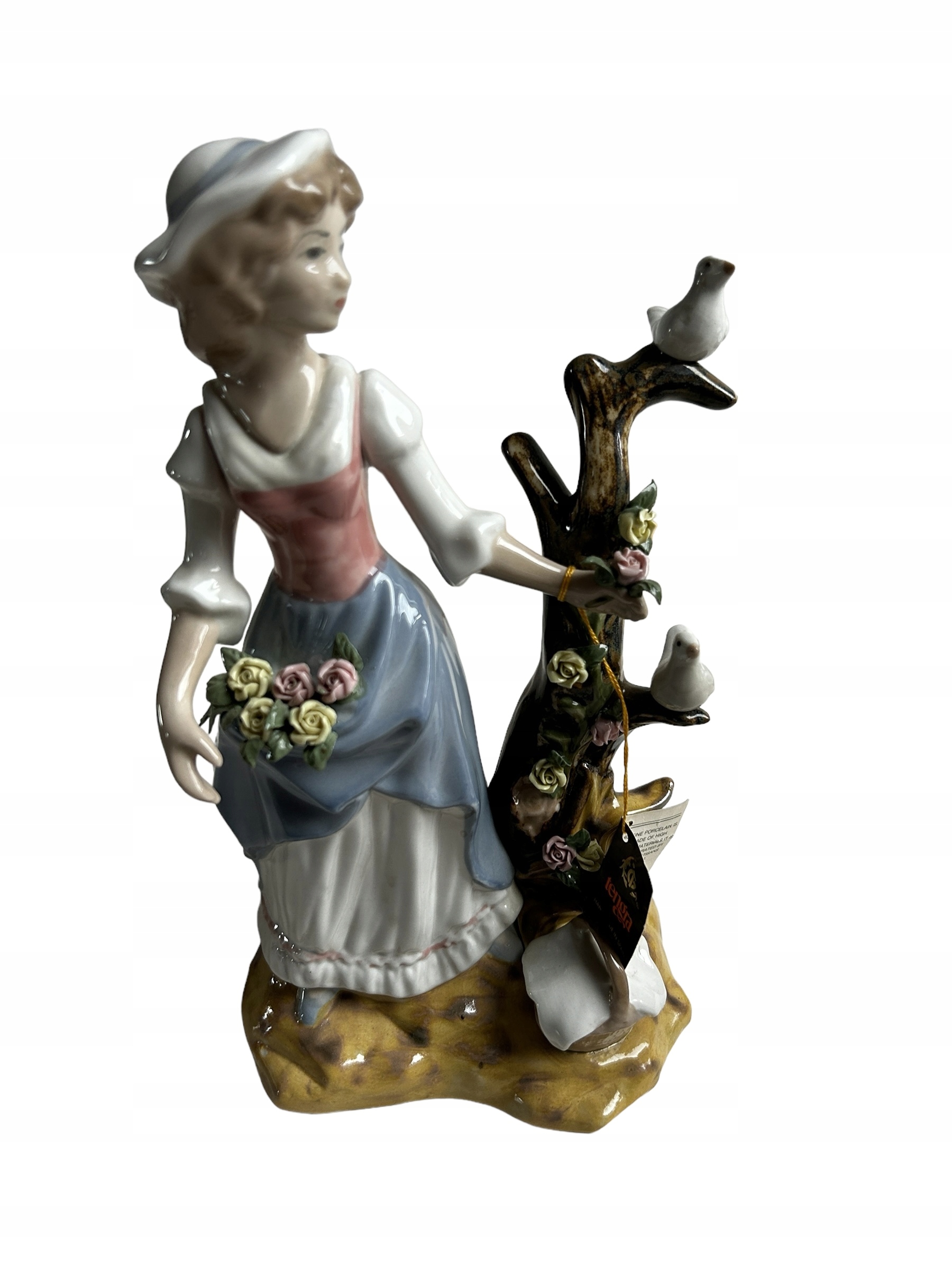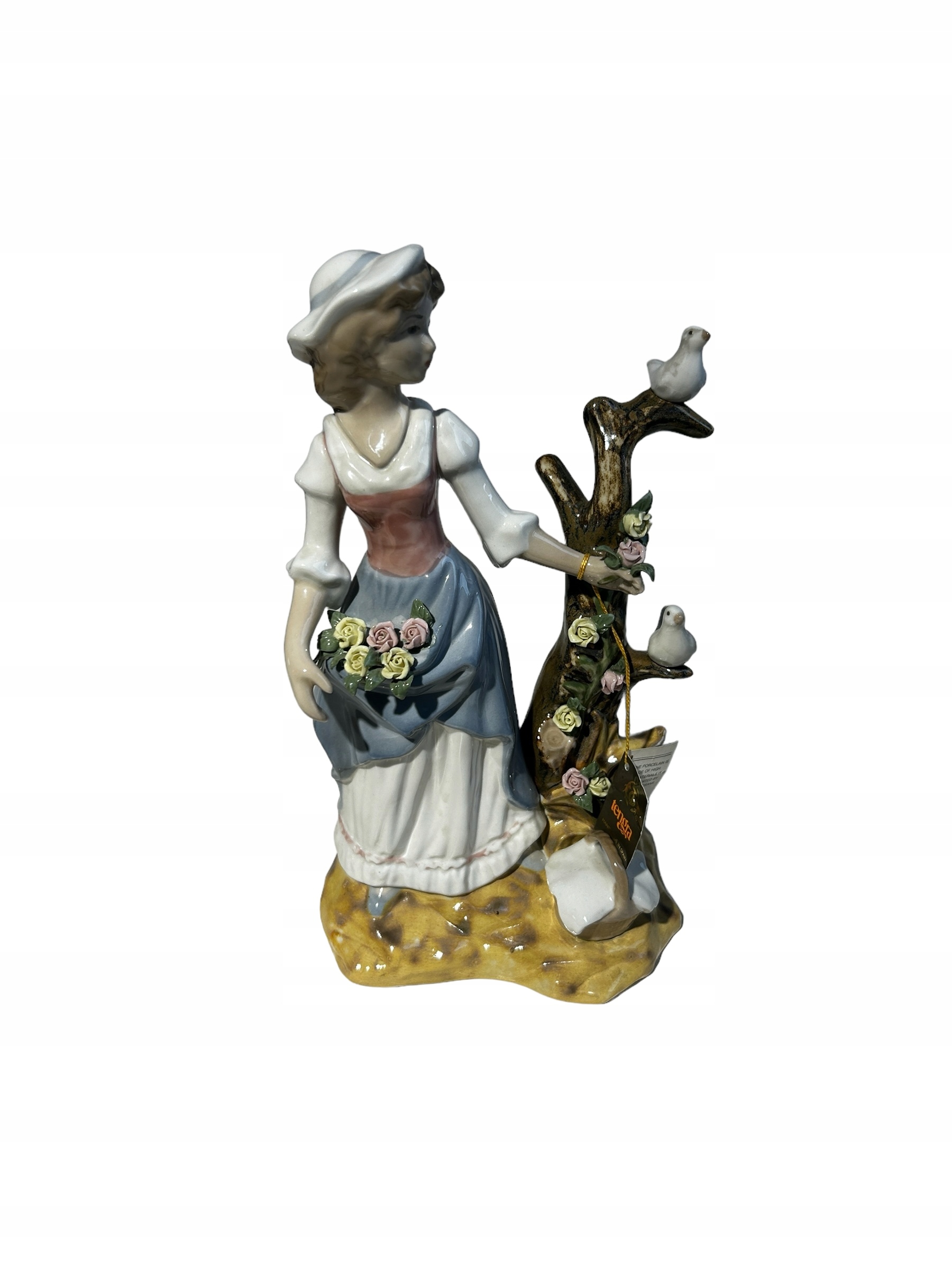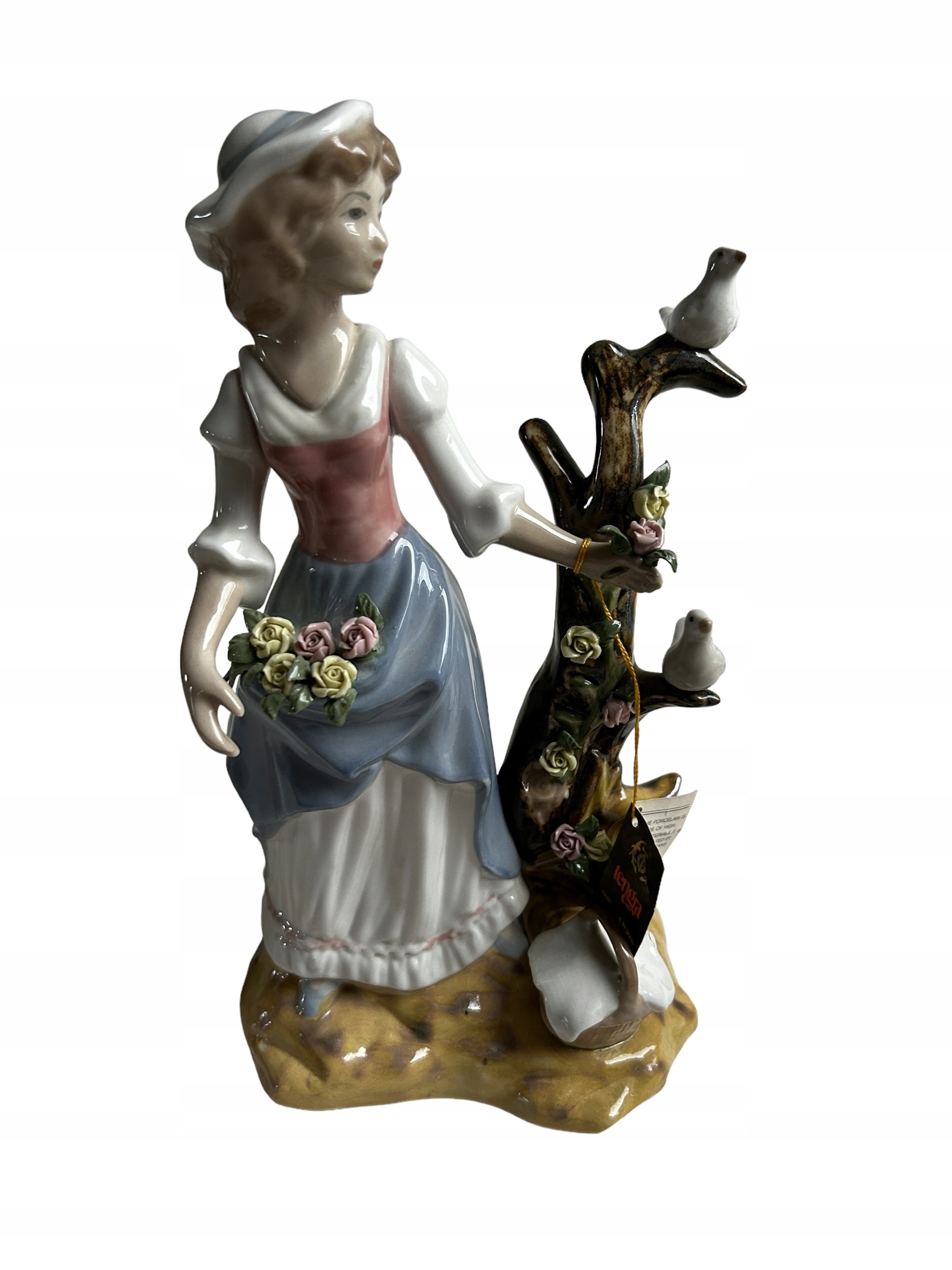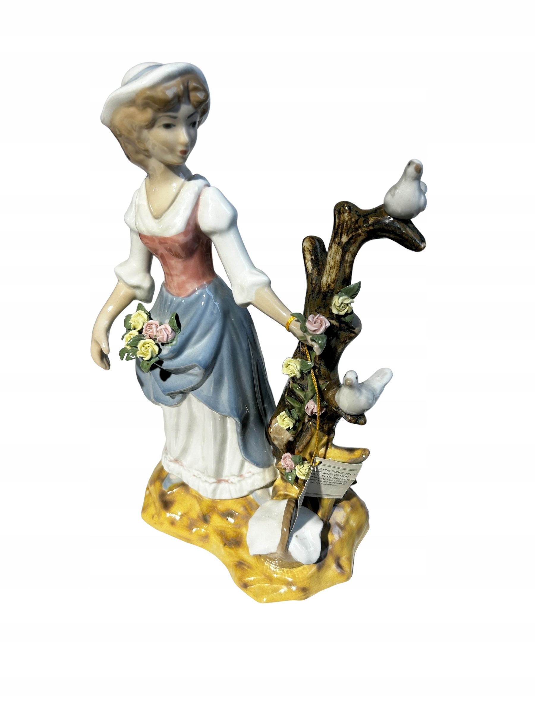 Фарфорова статуетка від іспанського виробника Tengra Барвиста, з великою кількістю деталей. На ньому зображена жінка в довгому вбранні та капелюшку, яка стоїть біля дерева, на якому сидять два білих птахи. Фігура тримає оберемок квітів. На дереві також видно троянди.