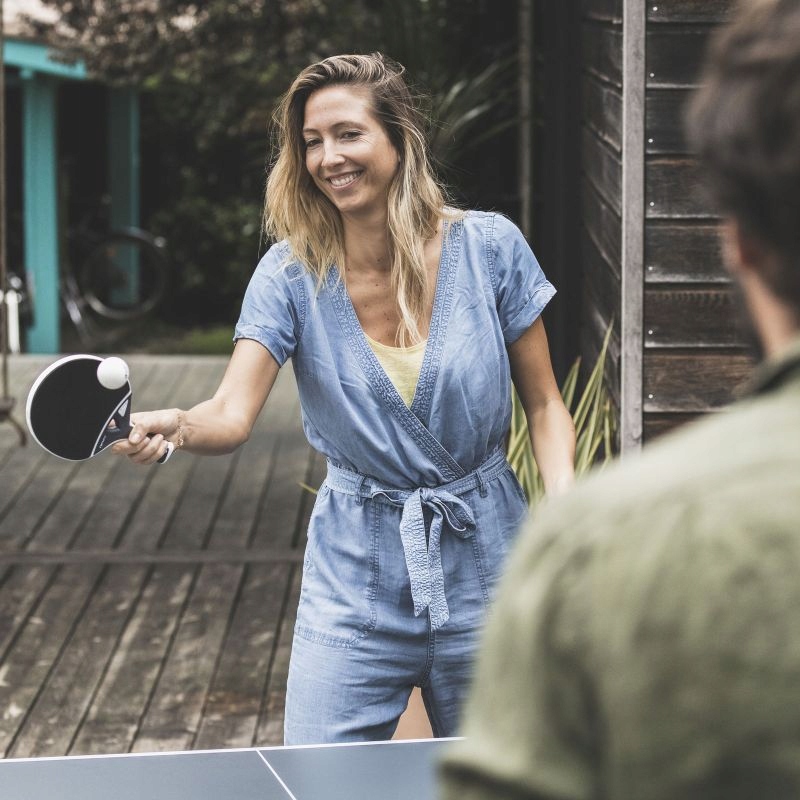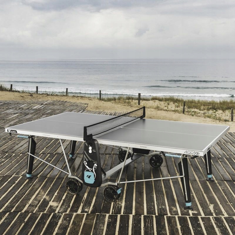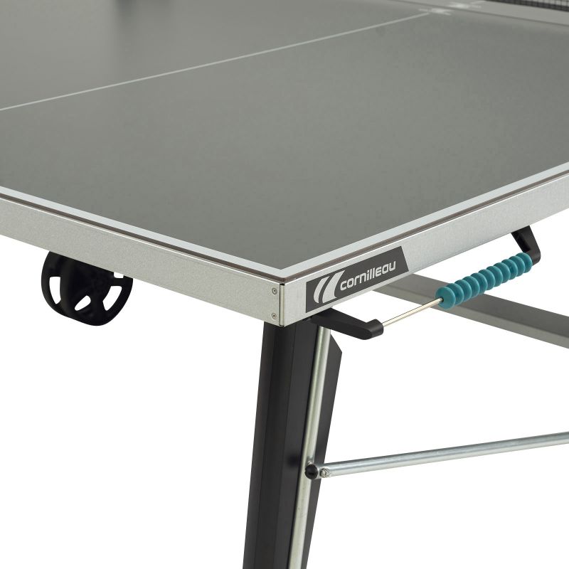 - Тенісний стіл Cornilleau 400X — топова модель серії Sport, призначена для використання на вулиці. Це ідеальний вибір для всієї родини. Завдяки подвійній системі безпеки DSI, подвійним колесам і потужним гальмам з цим впорається кожен. Стіл стійкий до погодних умов і ідеально підходить для саду або тераси.