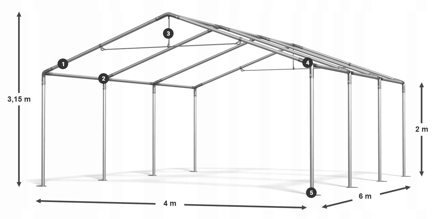 1 - Дах PE (поліетилен) прибл. 240 г/м² 2 - Шторка ворота 3 - Міцні блискавки YKK на входах 4 - Змінна маскування 5 - Бокові стінки ПЕ 2 х 2 м (поліетилен) добре. 240 г/м² - Вітражі 140 х 130 см 6 - Вушка для кріплення брезенту