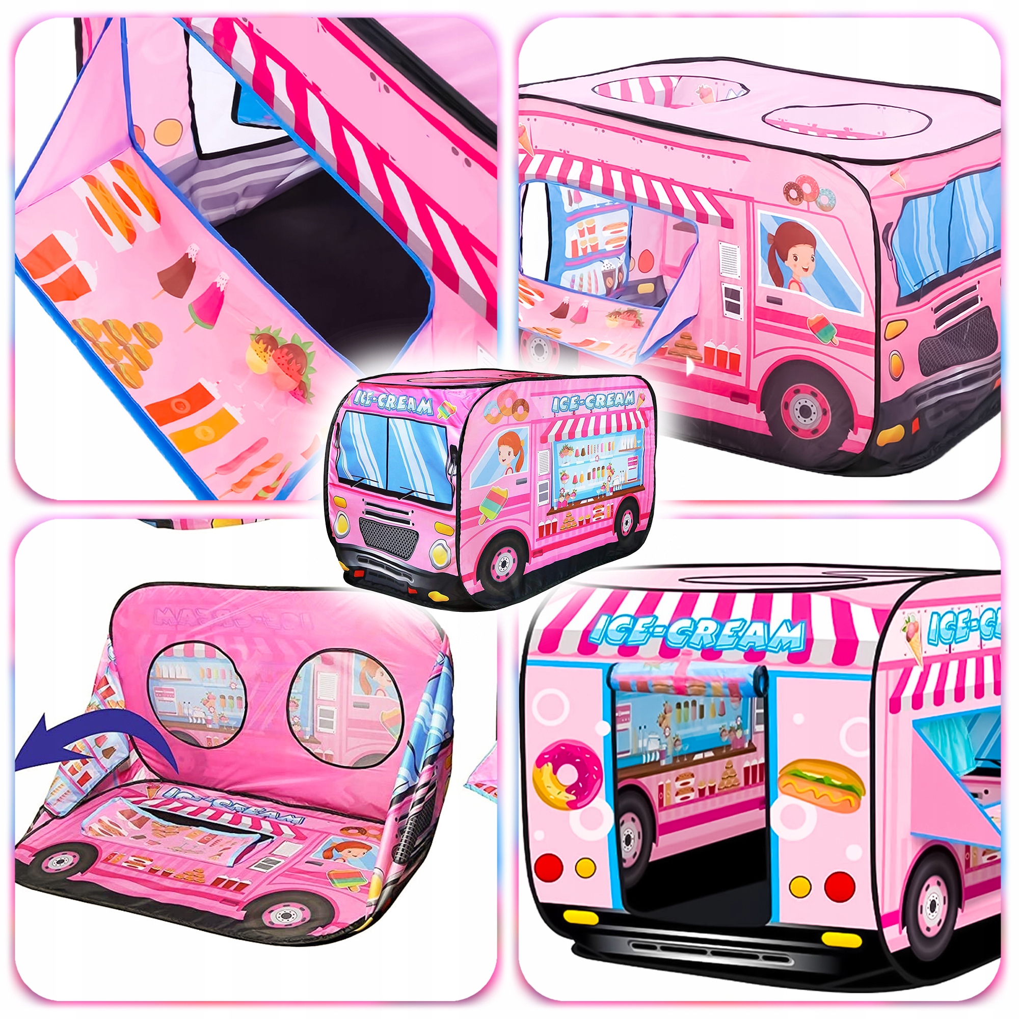 Намет у формі вантажівки з морозивом — ідеальне місце для творчих розваг — як вдома, так і на природі. Це дозволяє вам грати за продавця, клієнта, водія чи кухаря, розвиваючи уяву та соціальні навички вашої дитини.