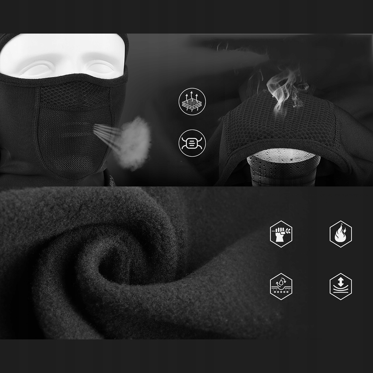 🔥 Зона рота і носа оснащена дихаючою сіткою, яка мінімізує накопичення вологи всередині маски і ефективно запобігає запотіванню окулярів при диханні. Відкриття для вух полегшує носіння окулярів.