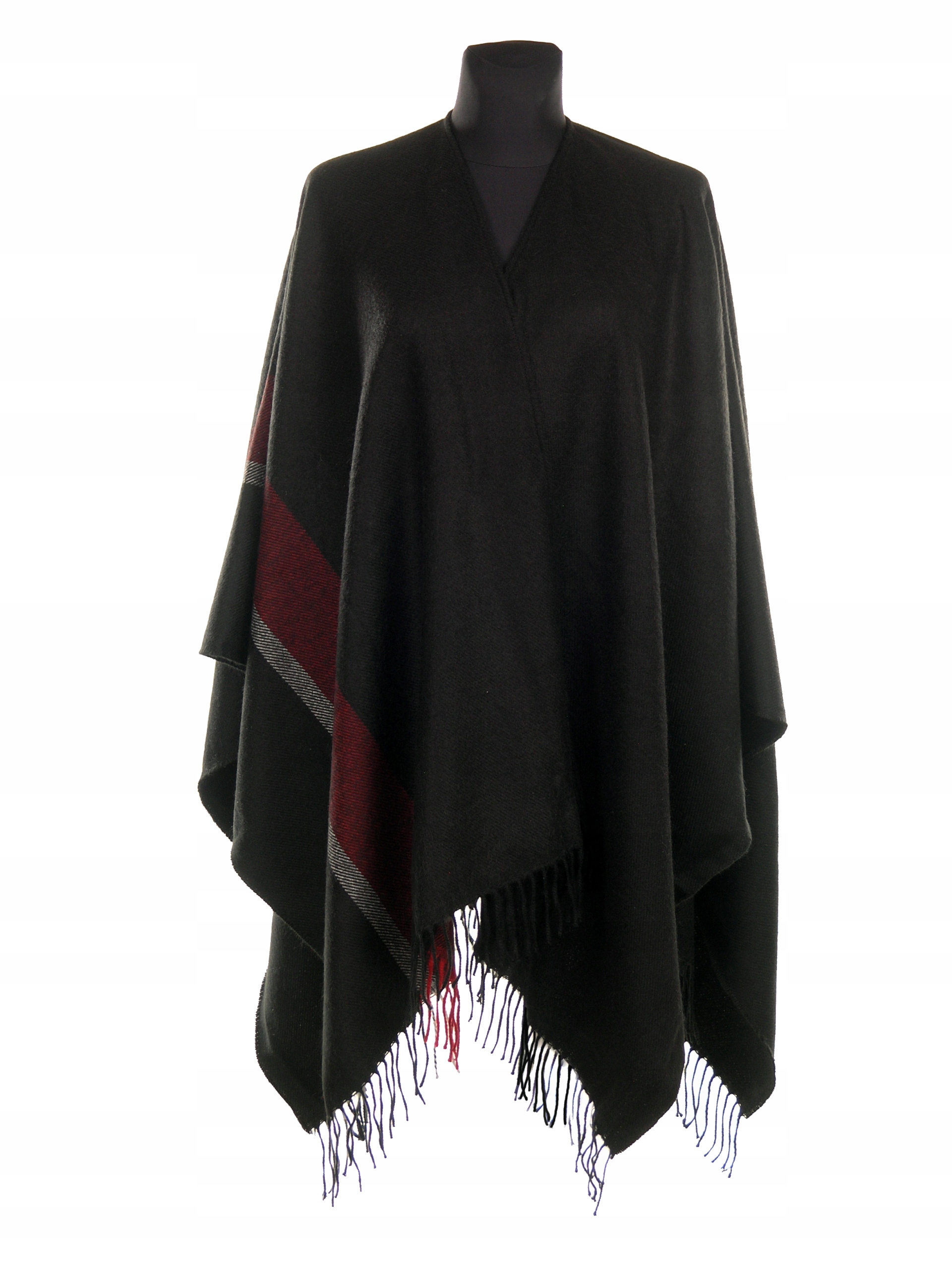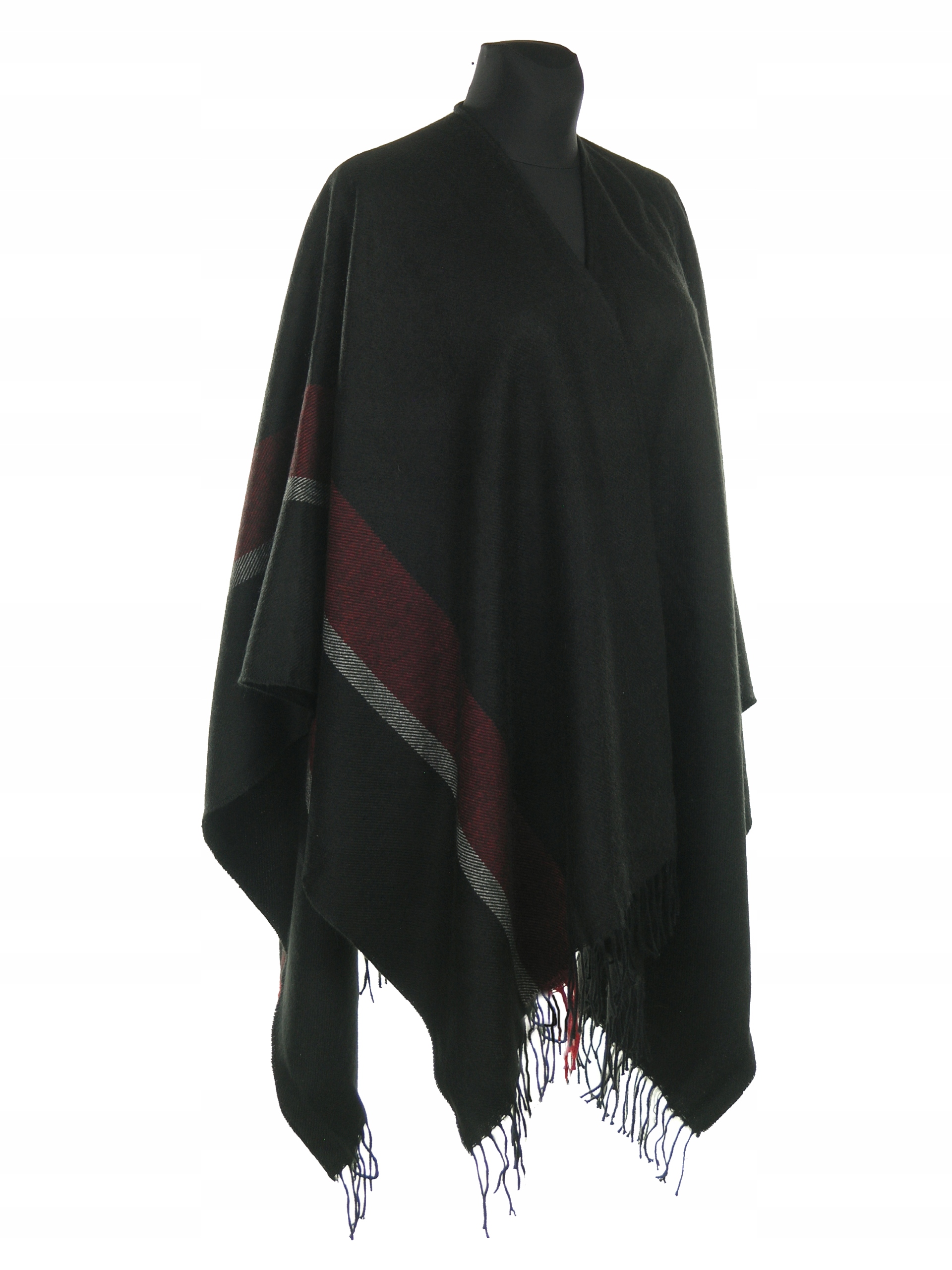 Чорне пончо з асиметрично розташованим темно-червоним поясом.
