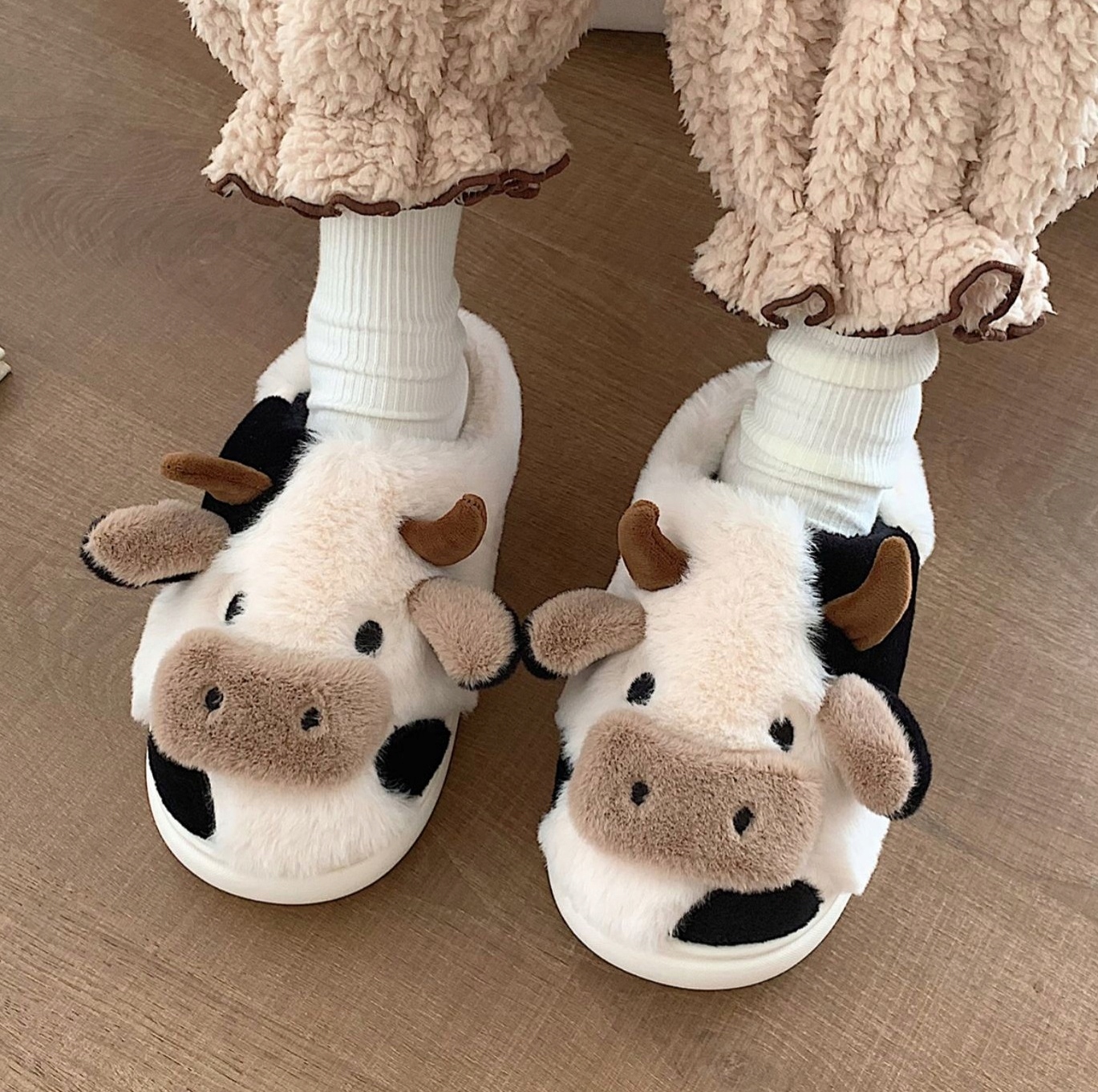 Теплі тапочки з декоративними плюшевими вставками з мотивом корови. Виготовлений з приємного на дотик матеріалу. Вони зручні та теплі - ідеальні для холодних днів.