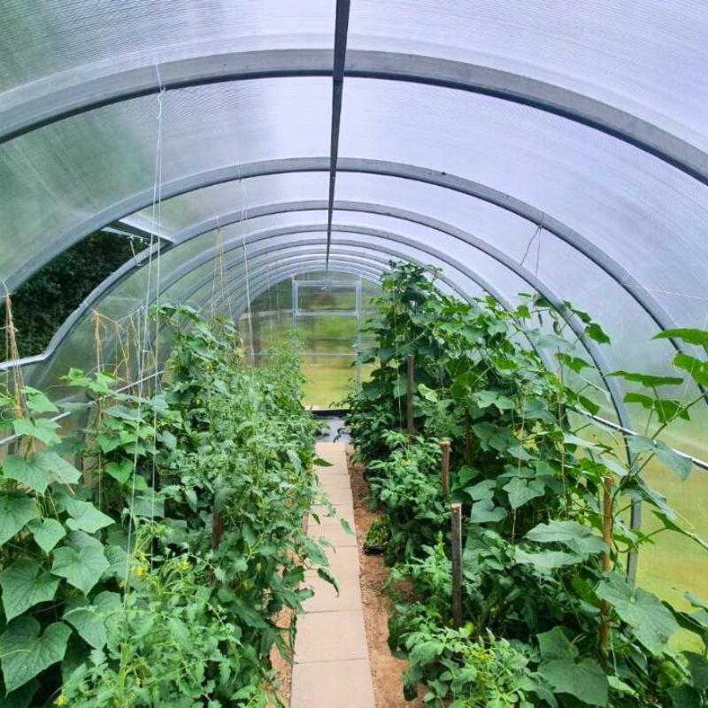 - Покриття - 4 мм стільниковий полікарбонат стійкий до ультрафіолетового випромінювання та стандартних погодних умов (сніг , дощ, дрібний град). Має 5 років гарантії та термін служби до 10 років. Маючи міцний і міцний каркас, теплиця витримує снігове навантаження до 80 кг на м2 (еквівалентно 25-30 см свіжого снігу), а значить, полікарбонат легко витримає навіть сніжну зиму. Кругла форма теплиці запобігає накопиченню снігу.