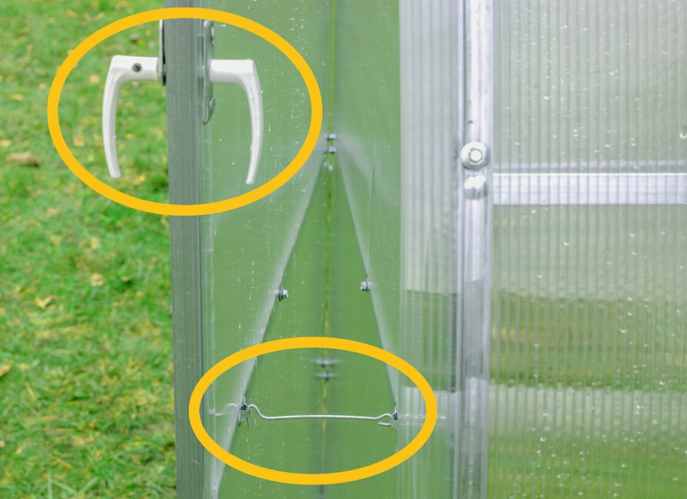 Теплиця має двоє дверей з кожного боку. У двері теплиці вже встановлені вікна.