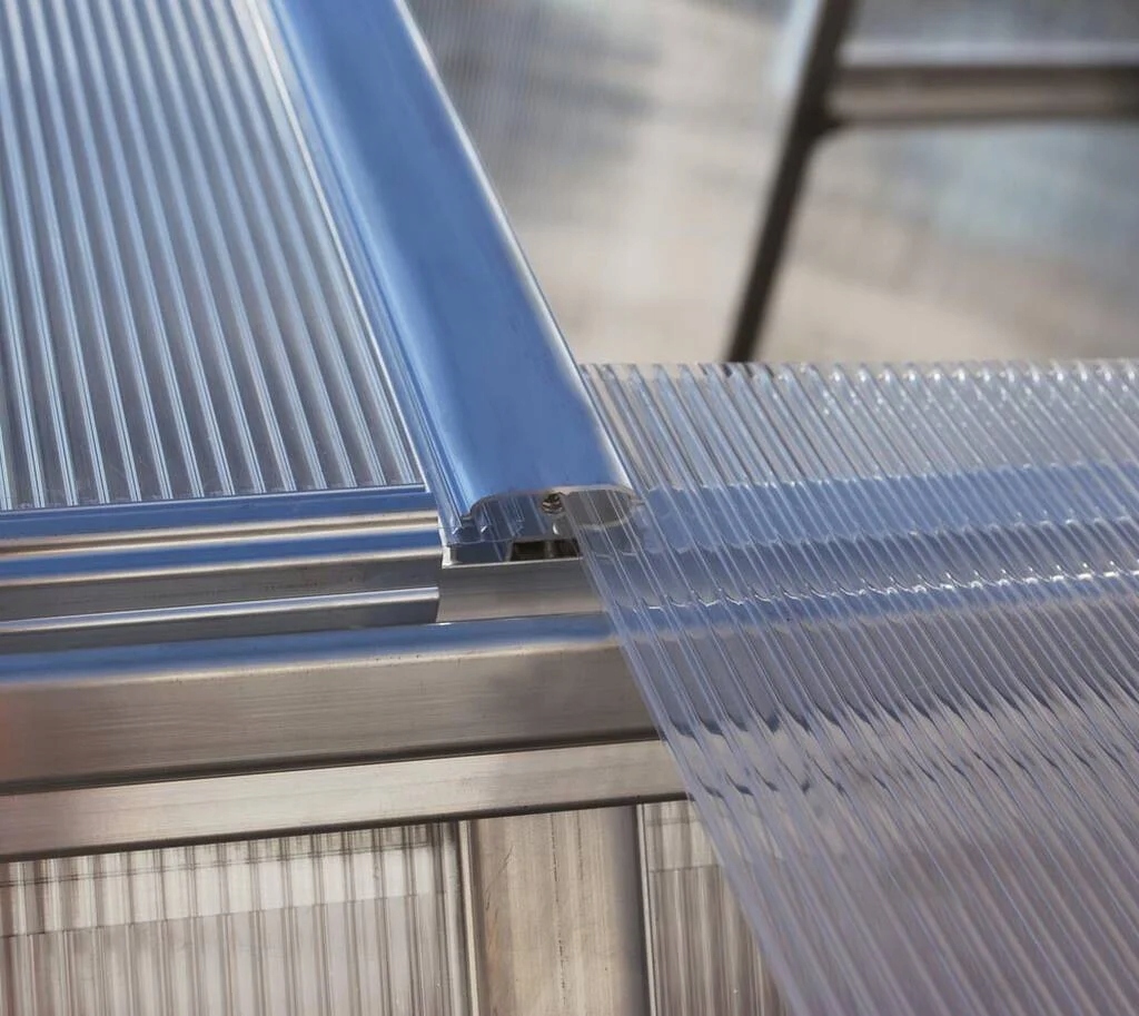 Стіни та дах зроблені з стільникового полікарбонату товщиною 6 мм, який пропускає до 80% природного світла, захищаючи рослини від надлишку УФ-променів. Завдяки цьому ваші культури розвиваються при стабільній температурі, а приміщення не перегрівається навіть у сонячні дні.