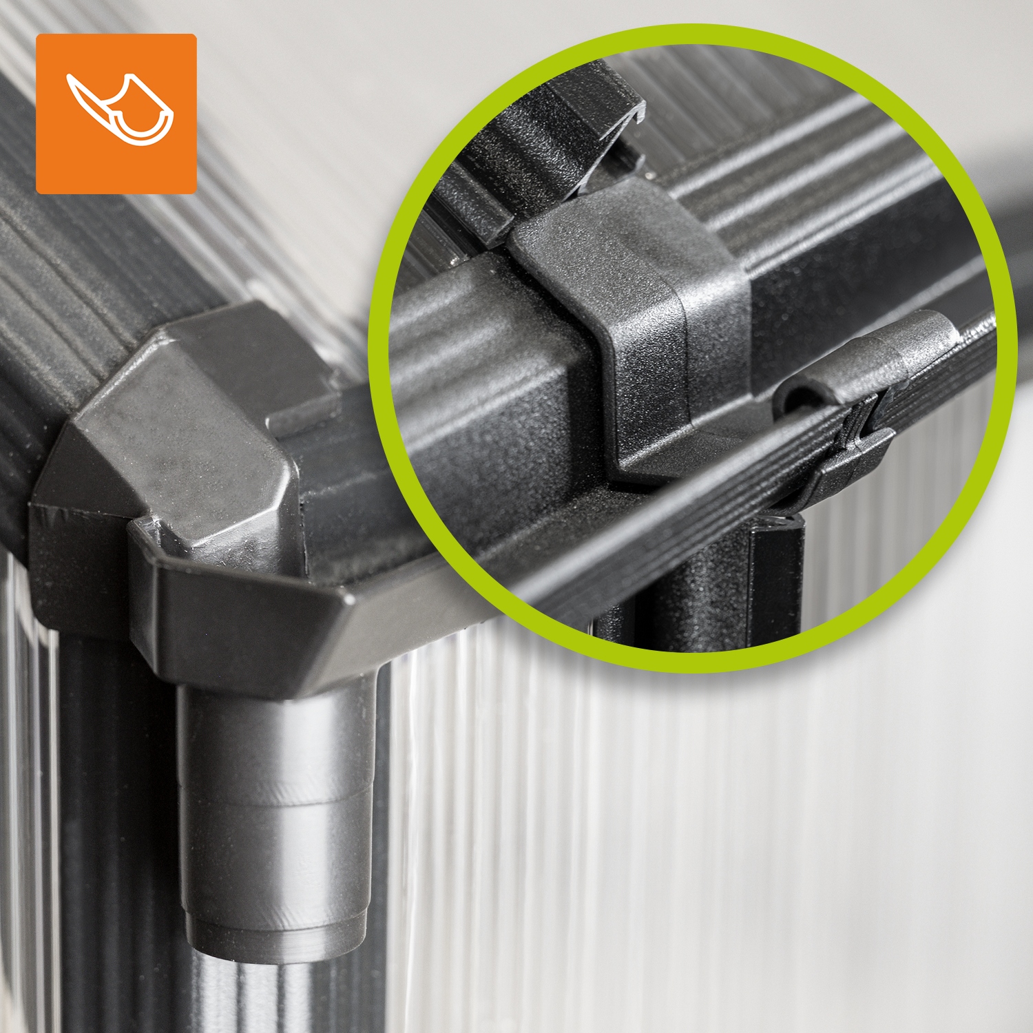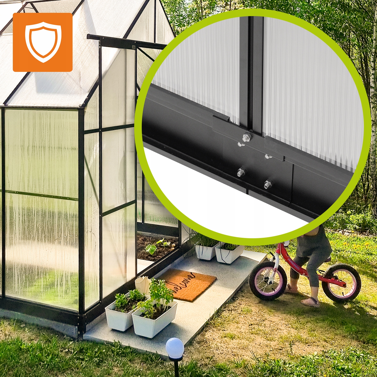 Профіль виготовлений з алюмінієвого та полікарбонатного скла - завдяки якому конструкція світла і довговічна. Набір включає металеву основу, яка дозволяє заїхати в землю. Оранжерея оснащена вікнами даху з регулюванням висоти, що сприяє поведінці правильної циркуляції повітря . Крім того, у теплиці є подвійні розсувні двері на роликових ковзанах та жолобах водних вод.